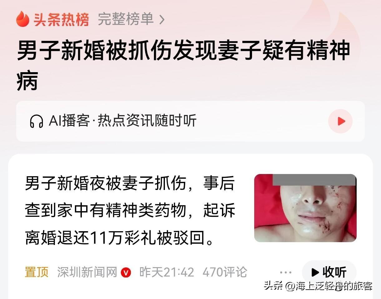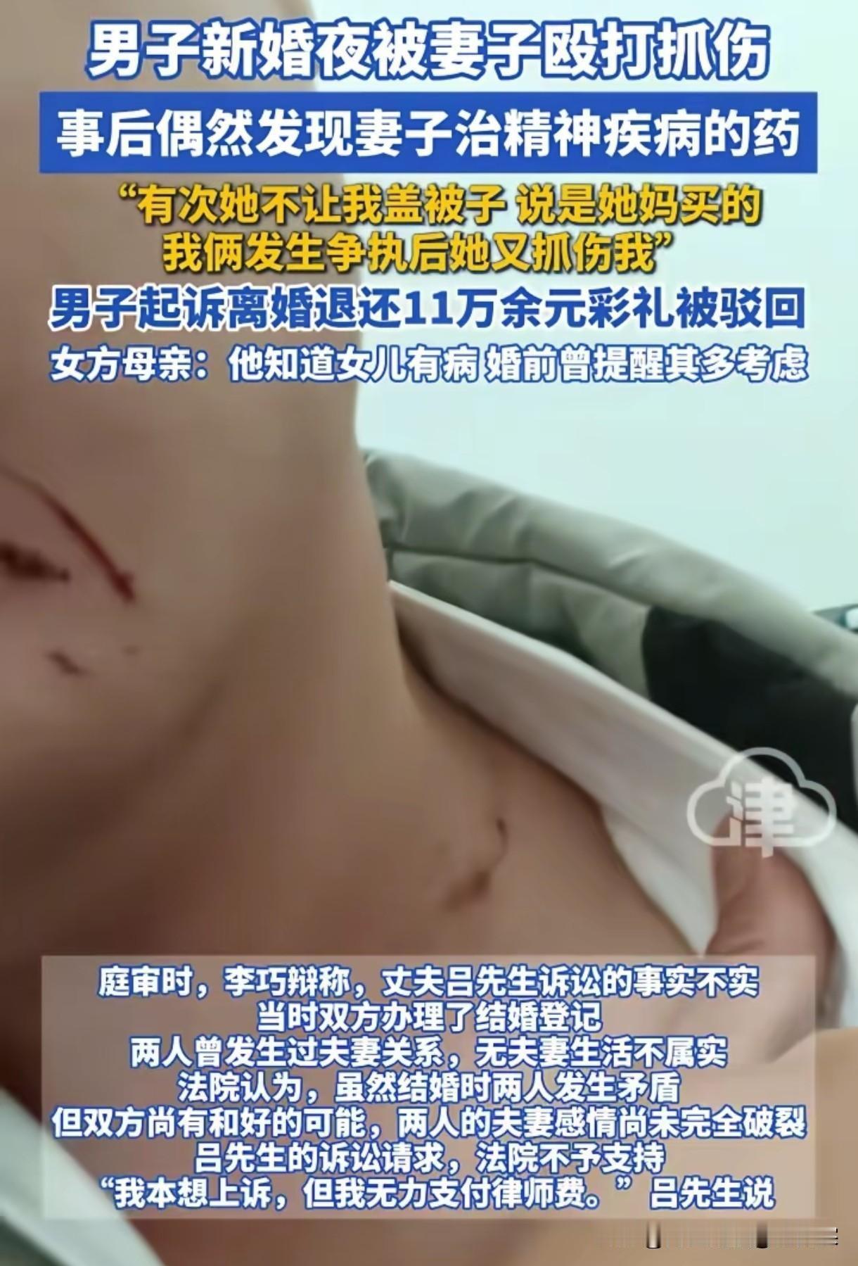 “电视剧都不敢这么拍!”四川达州,新婚夜,男子想和妻子发生夫妻关系,妻子抗拒,抓伤了男子。几天后,妻子不让男子同盖一床被子,再次将男子抓伤,男子没有多想,去了外地上班。几个月后,他回到家中,在柜子里发现了一个贴有妻子名字的精神类药物,男子崩溃,起诉离婚,并要求对方返还11万彩礼。可女子却不同意离婚,说丈夫520还给自己送了鲜花和红包,两人感情并未破裂。结果让男子追悔莫及。 对于38岁的吕先生来说,这1年多的的婚姻生活就是一场噩梦,新婚夜的抓伤,妻子的种种反常举动,都让他觉得对方是在骗婚。 2024年9月,36岁的吕先生认识了比他小8岁的李巧,李巧念过大学,还当过老师,吕先生常年在外跑车,觉得这个姑娘的条件不错,欣然同意跟对方见面。 初次见面,李巧戴着眼镜,文文静静的,吕先生对她很有好感。 李巧的父母对吕先生也满意,虽然他是跑货车的,但是那时吕先生已经在县城买了房子,还买了车子,对方觉得她有房有车,踏实肯干,是个过日子的人。 两人互有好感,加了微信后,经常联系,之后吕先生带着李巧去了重庆游玩,两人相处愉快。 2024年10月初,吕先生带着李巧回到了自己在佛山的出租房,两人在一起共同生活了20多天,但是这期间,李巧睡床,吕先生睡地上,他以为李巧害羞,想把第一次留在新婚之夜,也没有往别处想。 之后两人谈婚论嫁,进展顺利,2025年1月13日两人做了婚检,并领证结婚,几天后两人举办了热闹的婚礼。 新婚当晚,吕先生激动不已,想和妻子进行夫妻生活,可李巧抗拒,并抓伤了他。 吕先生不解,两人都已经结婚了,妻子这是在害怕什么。 他询问妻子是否有喜欢的人,可妻子却顾左右而言他,只一个劲的问他是不是在拍照录音。 次日回门,丈母娘问起,吕先生谎称自己摔的,丈母娘给了他2000元让他去医院。 几天后,两人又因盖被子的事情发生了争执,李巧说被子是母亲给自己的,不让吕先生碰,并再次抓伤了他。 吕先生也没太在意,觉得可能是两人相处时间短,妻子还没完全信任他。 之后他去了广东上班,妻子留在老家生活,两人分居两地。 2025年5月20日,吕先生给妻子订了鲜花、发了红包。 2025年10月,吕先生回家,在壁柜里发现了贴有一盒李巧名字,购药时间为2025年8月6日的“利培酮片”,这种药是用来治疗精神分裂症的。 吕先生多次询问妻子,妻子却沉默不语,他怀疑妻子婚前隐瞒病情,自己遭遇了骗婚,他一纸诉状,将李巧告上了法庭,起诉离婚,并要求对方返还11万余元彩礼。 可没想到,李巧却不同意离婚,她说两人曾在吕先生的新房里,发生过夫妻关系,是有夫妻之实的,结婚当天,是因为自己生理期,才拒绝了对方。 婚后她住在吕先生的房子里,丈夫520还给她买了鲜花,发了红包,两人感情并未破裂,并且两人已经办理了结婚登记,彩礼也不应该退还。 法院认为两人结婚时发生了矛盾,可婚后吕先生在特殊日子转款,给妻子送鲜花,夫妻感情并未完全破裂,一审法院判决两人不准予离婚。 对于这个结果,吕先生表示自己无法接受。 他婚前拼尽全力,不惜借债支付彩礼,本想找个人好好过日子,组建一个温馨的家庭。 可妻子在婚后的种种反常行为,如拒绝夫妻生活,将他抓伤,还隐瞒病情等,都让他怀疑对方是在骗婚,这段婚姻已经没有继续下去的必要了。 针对吕先生的困扰,有人给他出了主意,可以带妻子去医院检查,看妻子婚前是否有精神类疾病。 如果有,对方就应该在婚前告知吕先生,如果对方没有告知,吕先生可以向法院申请撤销两人的婚姻。 《母婴保健法》第9条规定:经婚前医学检查,对患指定传染病在传染期内或者有关精神病在发病期内的,医师应当提出医学意见;准备结婚的男女双方应当暂缓结婚。 如果一方在婚前患有精神类疾病,需要提前告知另一方,由另一方考虑是否要继续结婚。 如没有告知的,另一方在婚后发现后,可以在知道撤销事由之日起一年内提出撤销婚姻。 对于吕先生来说,他和李巧认识3个多月就结婚了,李巧在四川生活,他在广东,两人聚少离多,在发现李巧的异常行为后,也没有去深究,这才一步错,步步错。 男女结婚,需要在双方相互了解,自愿的基础上进行,婚前多花钱时间去了解对方,包括包括对方的性格、价值观、生活习惯、健康状况等,多跟对方相处,看看对方是否适合结婚。 至于李巧及其父母,如果婚前隐瞒了李巧患病的事实,那也是不厚道的,这种行为违背了公序良俗,做人应当坦诚一点,诚信待人,谎言终有被拆穿的一天。 对于此事,大家怎么看?