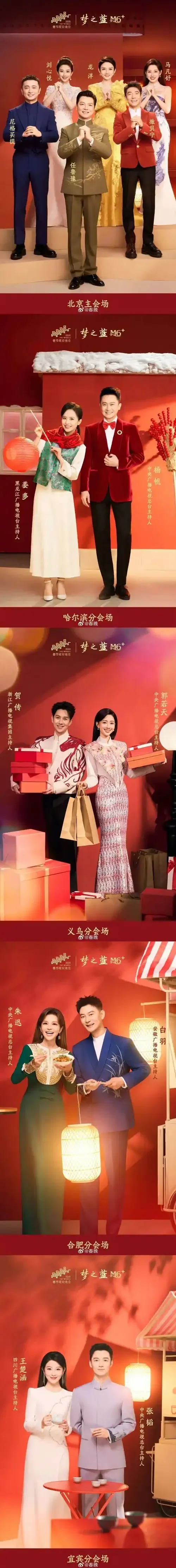 今年春晚延续了“主会场+分会场”的模式,四个分会场分别设在黑龙江哈尔滨、浙江义乌、安徽合肥和四川宜宾 。每个会场都配备了两位主持人,采用“央视主持人+地方台主持人”的搭档形式,既保证了国家级的专业水准,又融入了浓郁的地方特色。