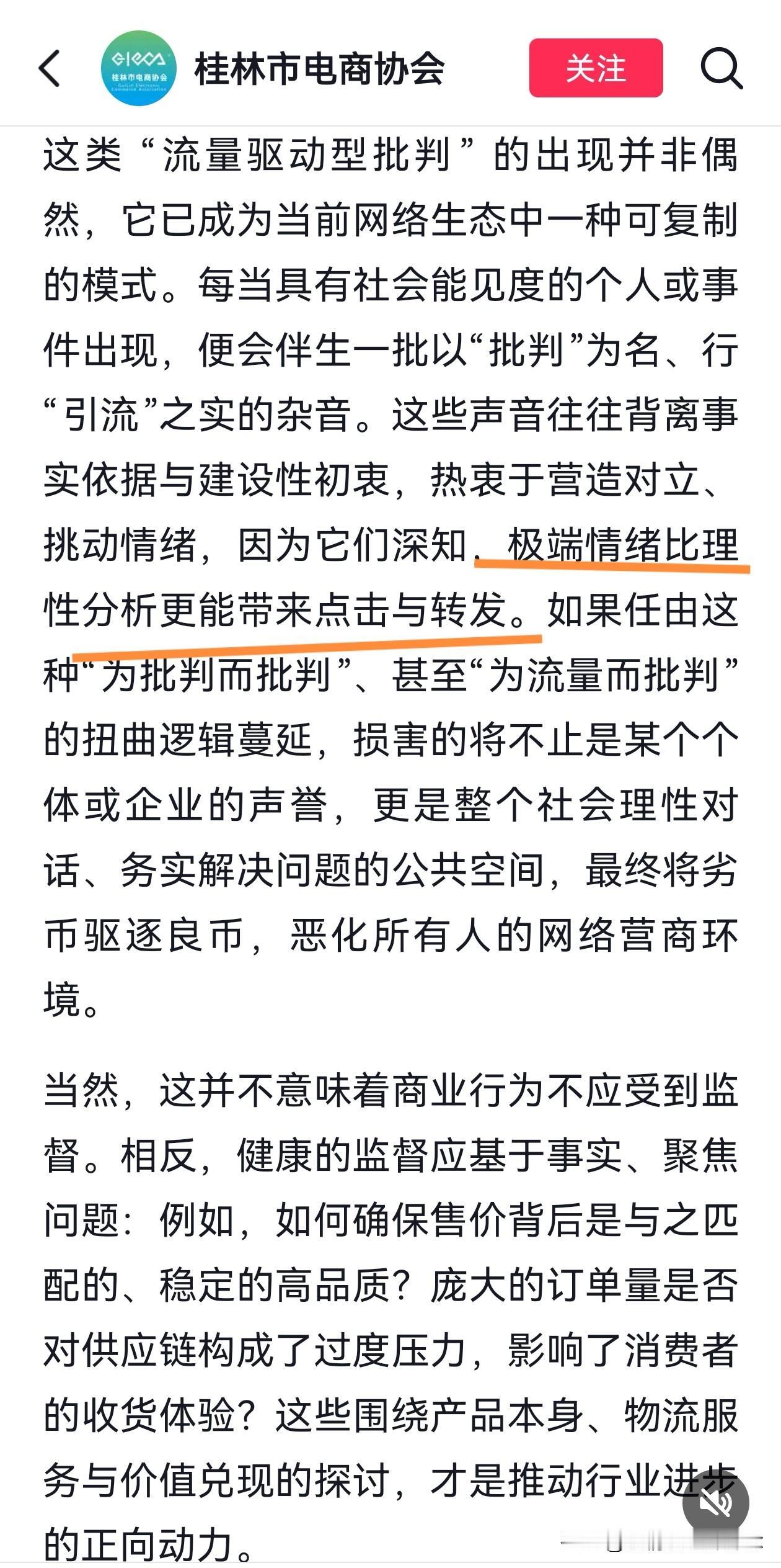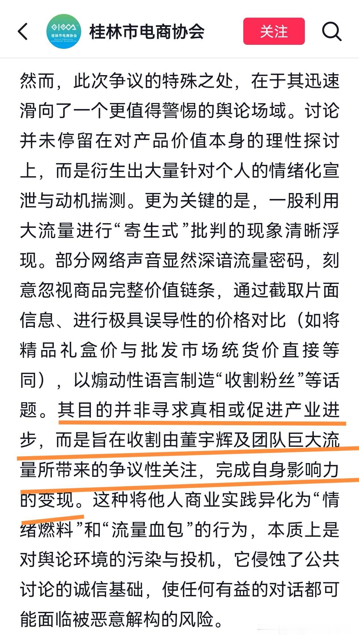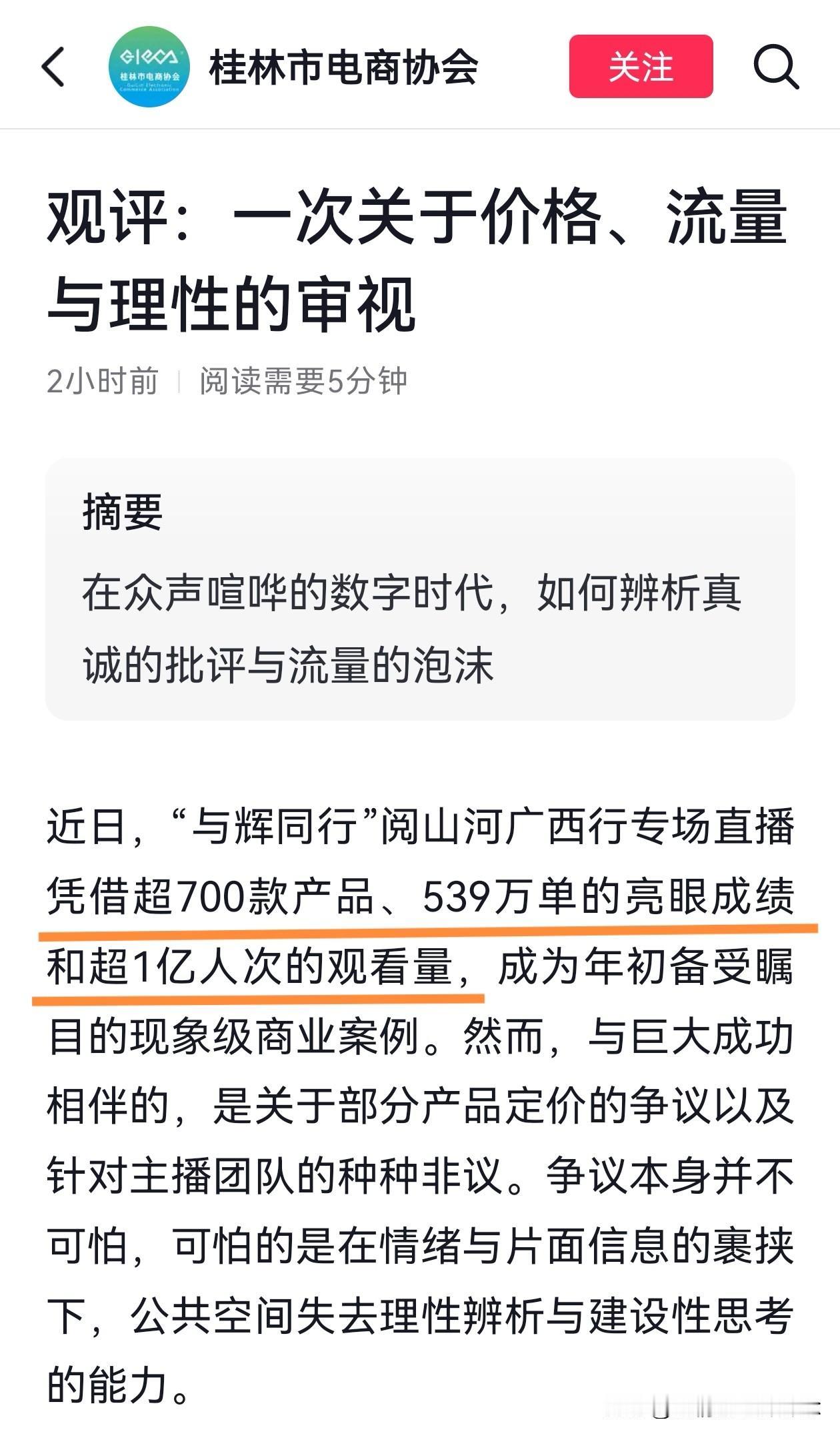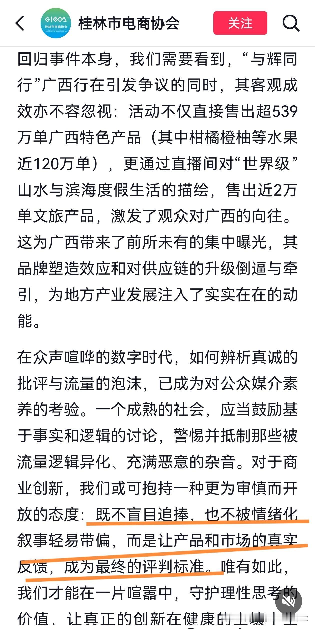 桂林市电商协会真是正能量满满! 直接发文用数据说话, “与辉同行”阅山河广西行专场直播超700款产品,直接售出超539万单广西特色产品(其中柑橘橙柚等水果近120万单),售出近2万单文旅产品,超1亿人次的观看! 今天真是让人精神振奋的一天,一早就看到李亚鹏在年会上感谢宇辉的视频,接着又刷到新京报为“与辉同行”卖春联一事发声,刚才又看到了桂林市电商协会的发文。 文章直接指出,网络上那些诋毁,造谣,煽动对立的人,就是想借着宇辉的流量引起关注,从而造成自身影响力变现。真是一针见血,把那些人的小心思说透了。 桂林市电商协会真是正能量满满! 直接发文用数据说话, “与辉同行”阅山河广西行专场直播超700款产品,直接售出超539万单广西特色产品(其中柑橘橙柚等水果近120万单),售出近2万单文旅产品,超1亿人次的观看! 今天真是让人精神振奋的一天,一早就看到李亚鹏在年会上感谢宇辉的视频,接着又刷到新京报为“与辉同行”卖春联一事发声,刚才又看到了桂林市电商协会的发文。 文章直接指出,网络上那些诋毁,造谣,煽动对立的人,就是想借着宇辉的流量引起关注,从而造成自身影响力变现。真是一针见血,把那些人的小心思说透了。 未来可能还会有不同的声音,但那又何妨?心向光明,步履不停,终会拨开迷雾见晴天!