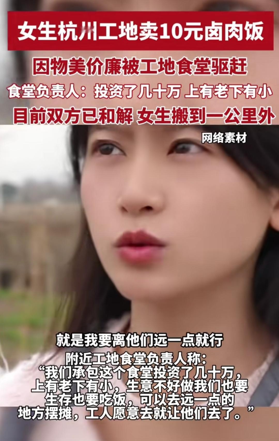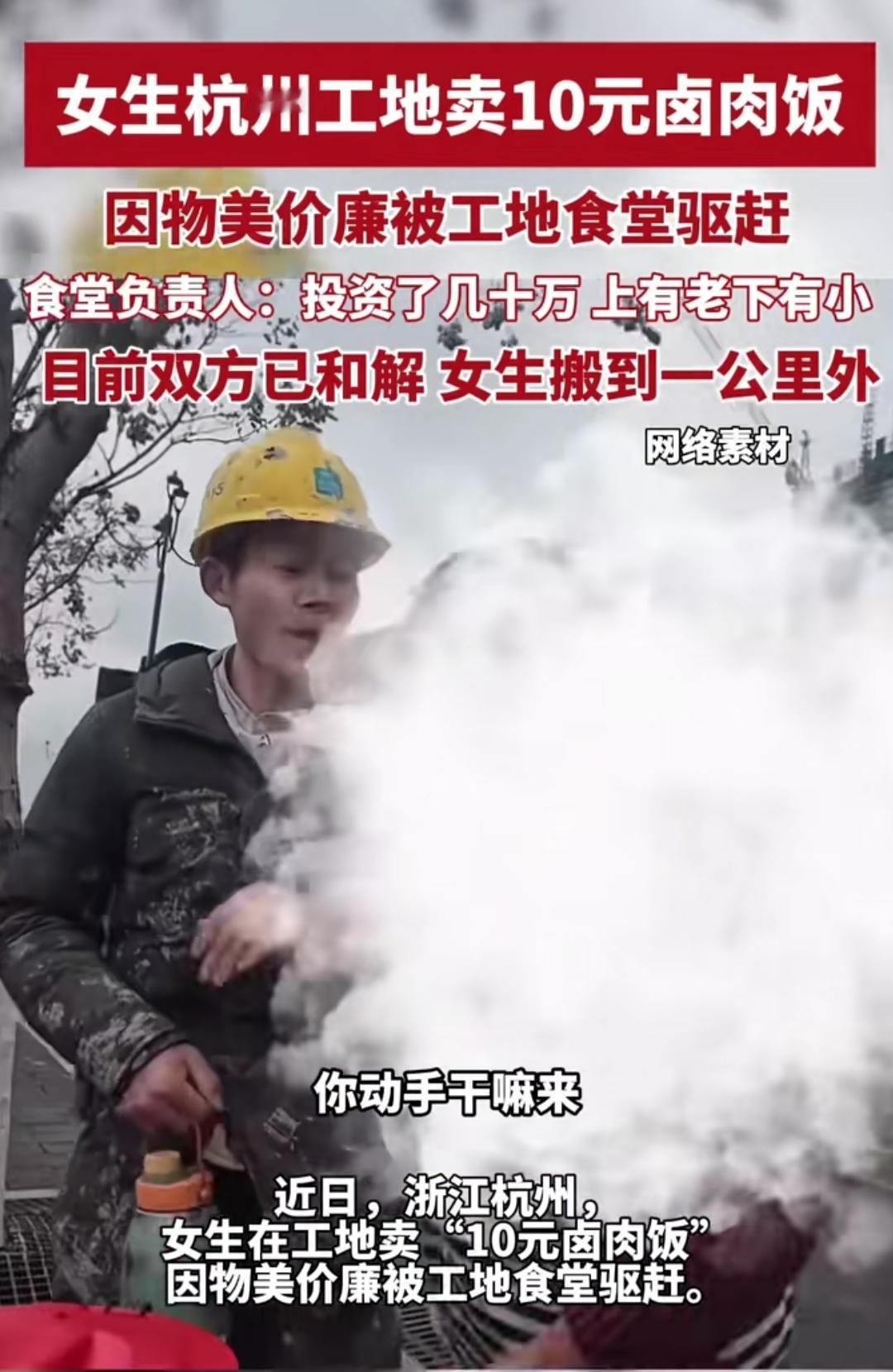 工地门口的烟火气,藏着两家人的生存难题!一名女生摆摊卖10元卤肉饭,味道实惠受欢迎,却遭到工地食堂的驱赶,这事一下戳中了无数打工人的心酸。 食堂老板也是一肚子委屈,他坦言自己投资几十万才盘下食堂,上有老下有小都指着这点收入过活。低价卤肉饭分走不少客源,自己的生意都快撑不下去了。 一边是为谋生奔波的摆摊女生,一边是背负投资压力的食堂经营者,两方各有各的难处。最终女生把摊位搬到一公里外,这场围绕生计的争执总算和解。 其实生活哪有那么多对错,不过是普通人在为碎银几两拼尽全力。在烟火人间里,每个人的日子都过得紧巴巴,谁都不容易啊。
