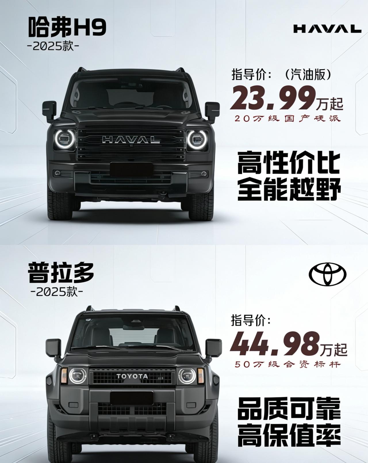 巅峰对决!25款哈弗H9和全新普拉多-PK场 价格维度 【哈弗H9】:23.99~25.79万!全系标配三把锁(前/后桥+中央差速锁)、博格华纳TOD四驱,柴油版还搭9AT变速箱,14.6英寸中控屏+华为HiCar、前排座椅通风/加热/按摩全给满,5/7座灵活选,791L大后备箱直接碾压同级。 【普拉多】:44.98~55.98万!仅提供2.4T双擎一种动力,低配车型连腰部支撑、电动座椅调节都没有,中控屏才10.25英寸,座椅配置寒酸到可能让家庭用户接受不了。 性能方面 【哈弗H9】:224马力汽油版/186马力柴油版任选,柴油版最大扭矩490N·m,4L模式下轮端扭矩高达16778N·m!224mm离地间隙+31°接近角+26°离去角,0.8米涉水深度堪比牧马人,蠕行模式让新手也能轻松征服炮弹坑。 ​ 【普拉多】:282马力双擎动力+全时四驱+托森中差,综合扭矩630N·m账面亮眼,但仅配中央差速锁,极限路况脱困能力稍逊。221mm离地间隙+30°接近角+21°离去角,通过性参数稍逊H9。 用车成本方面 【哈弗H9】:柴油版WLTC油耗仅8.8L/100km,一年跑1万公里比普拉多省3210元,0号柴油成本相对低,长期使用性价比高,越野玩家改装成本也低。 【普拉多】:WLTC油耗10.1L/100km,双擎系统保养成本高,配件价格昂贵,后期用车成本比H9高出一截,但是保值率比较大的优势(曾经号称理财产品)。 最后 👉 划重点:花普拉多一半的钱,H9给你越级配置,务实派直接狂喜! 👉 结论:轻度越野普拉多够用,重度穿越H9更硬核!