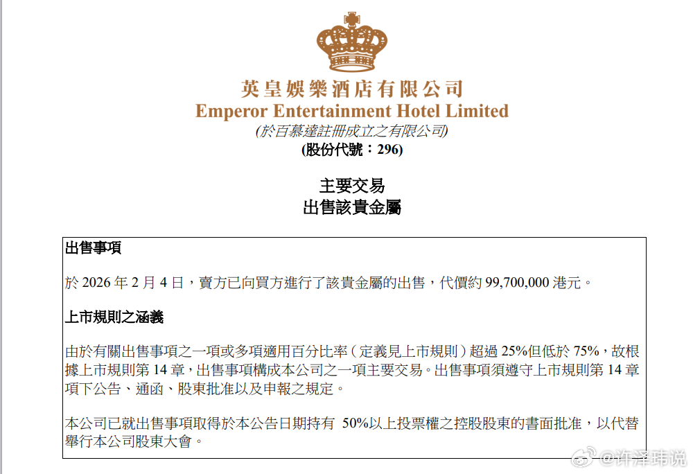 英皇娱乐酒店940万买黄金卖近1亿卖掉净赚9020万,20年黄金地砖直接变现