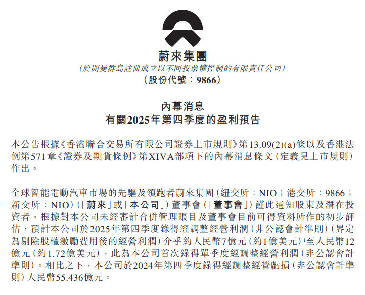 公司盘后在港交所公告,预计公司于2025年第四季度录得经调整经营利润(非公认会计准则)(界定为剔除股权激励费用后的经营利润)介乎约人民币7亿元(约1亿美元)至人民币12亿元(约1.72亿美元),此为公司首次录得单季度经调整经营利润(非公认会计准则)。(21财经)