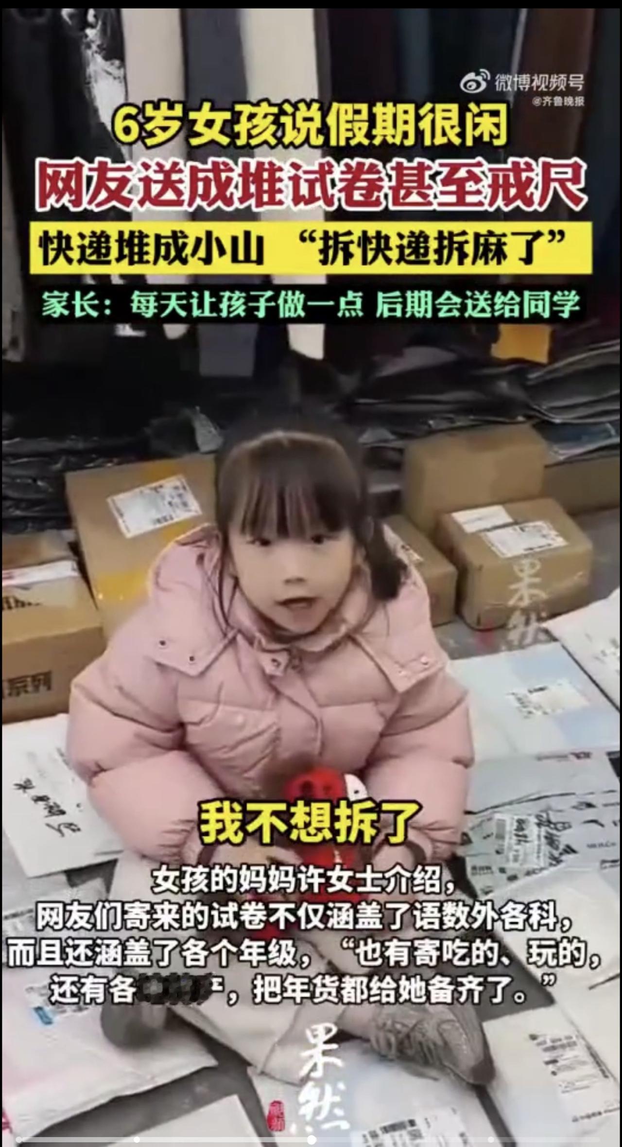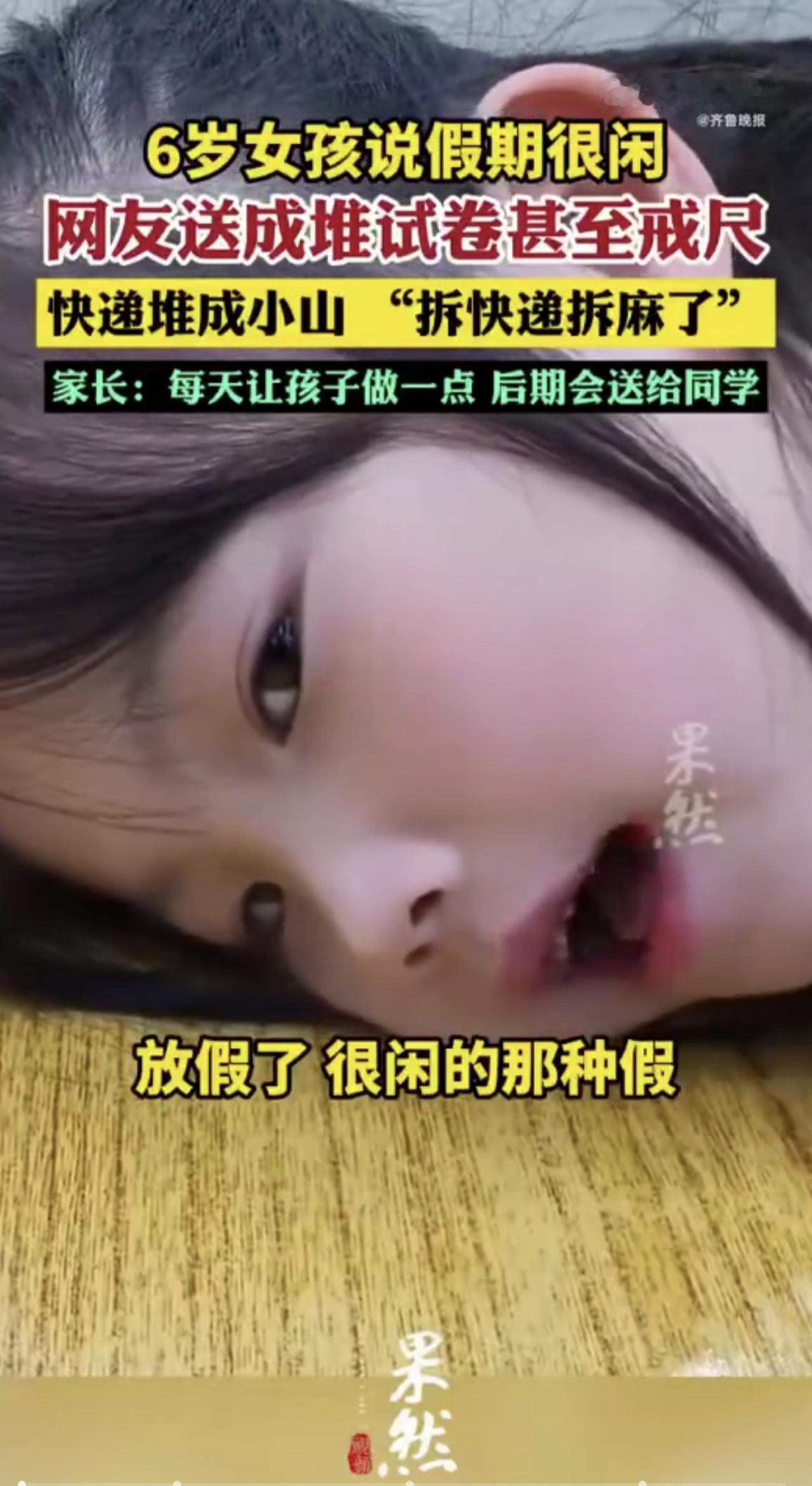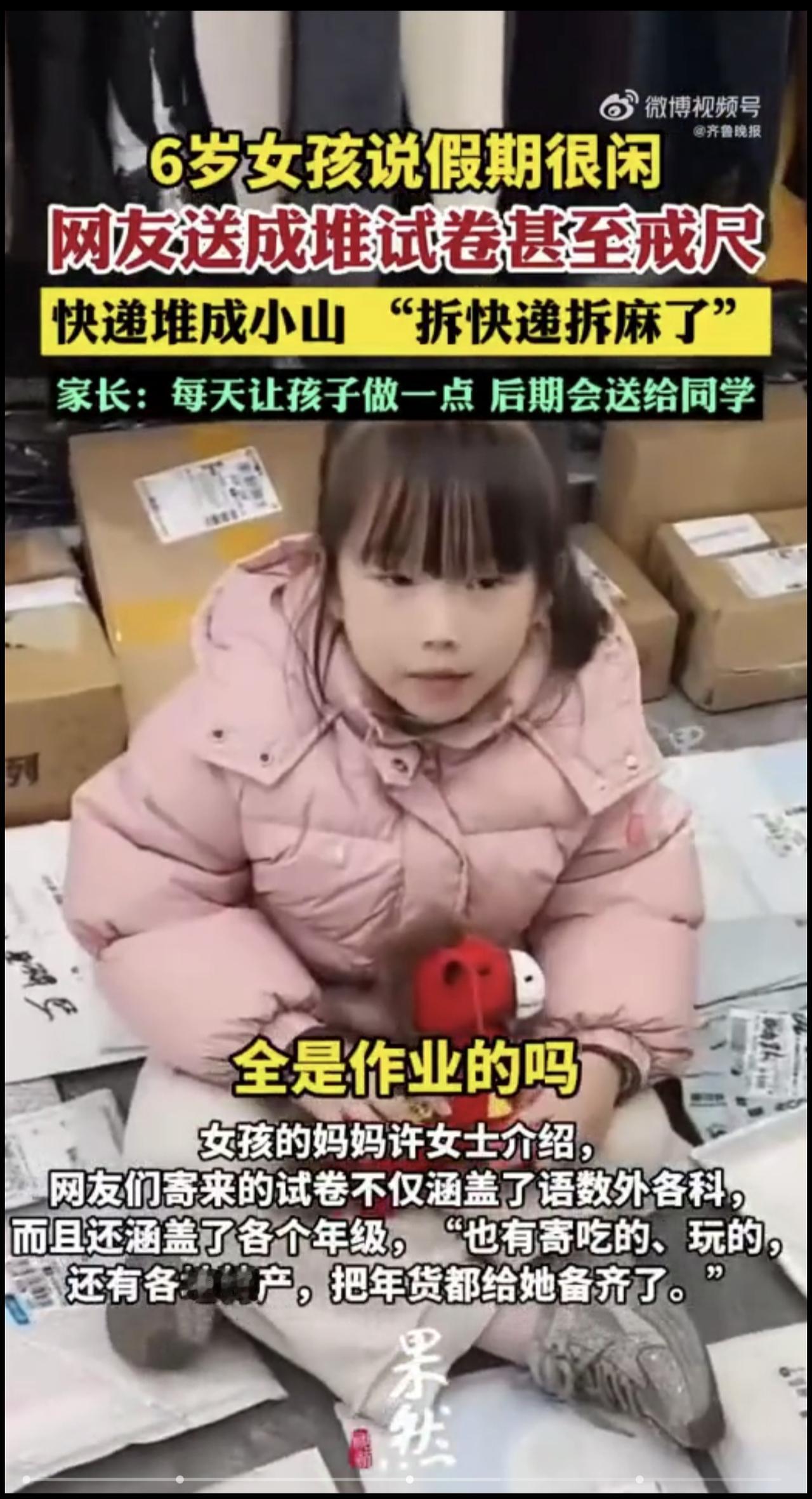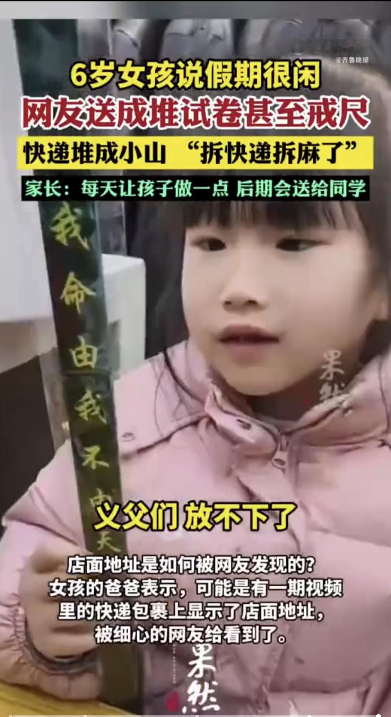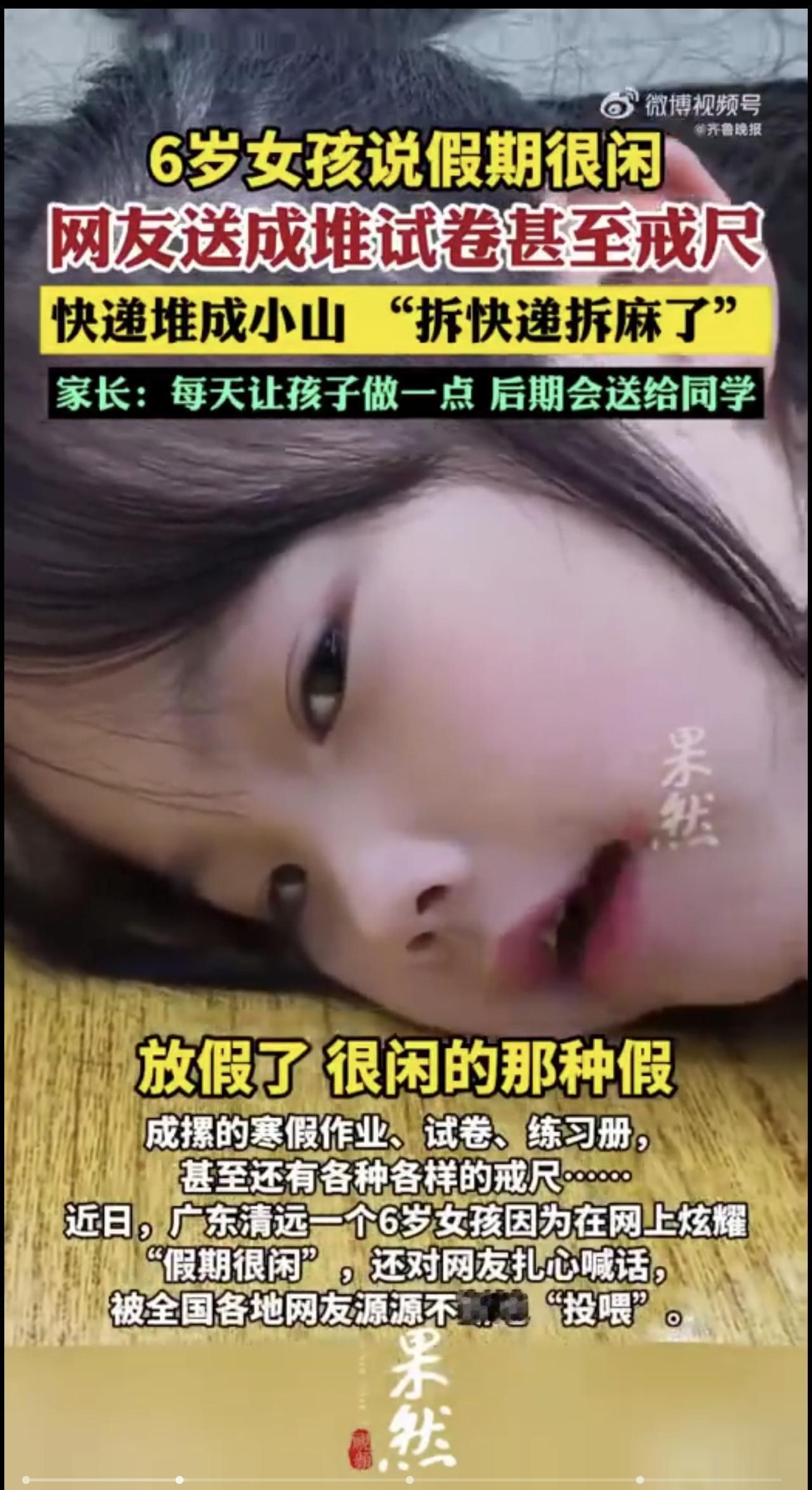 广东6岁女孩网上炫耀“假期很闲”,多地网友们寄来成堆的作业和戒尺:“太扎心了,必须给她找点事做”,有网友表示还要“投喂”其哥哥