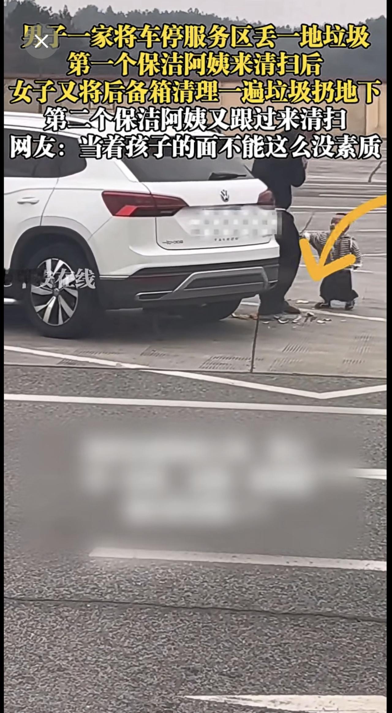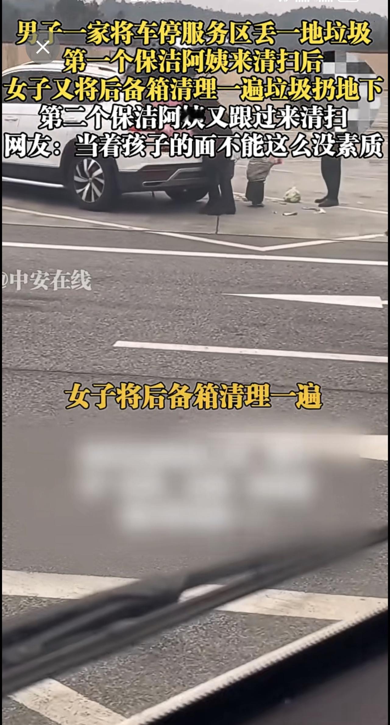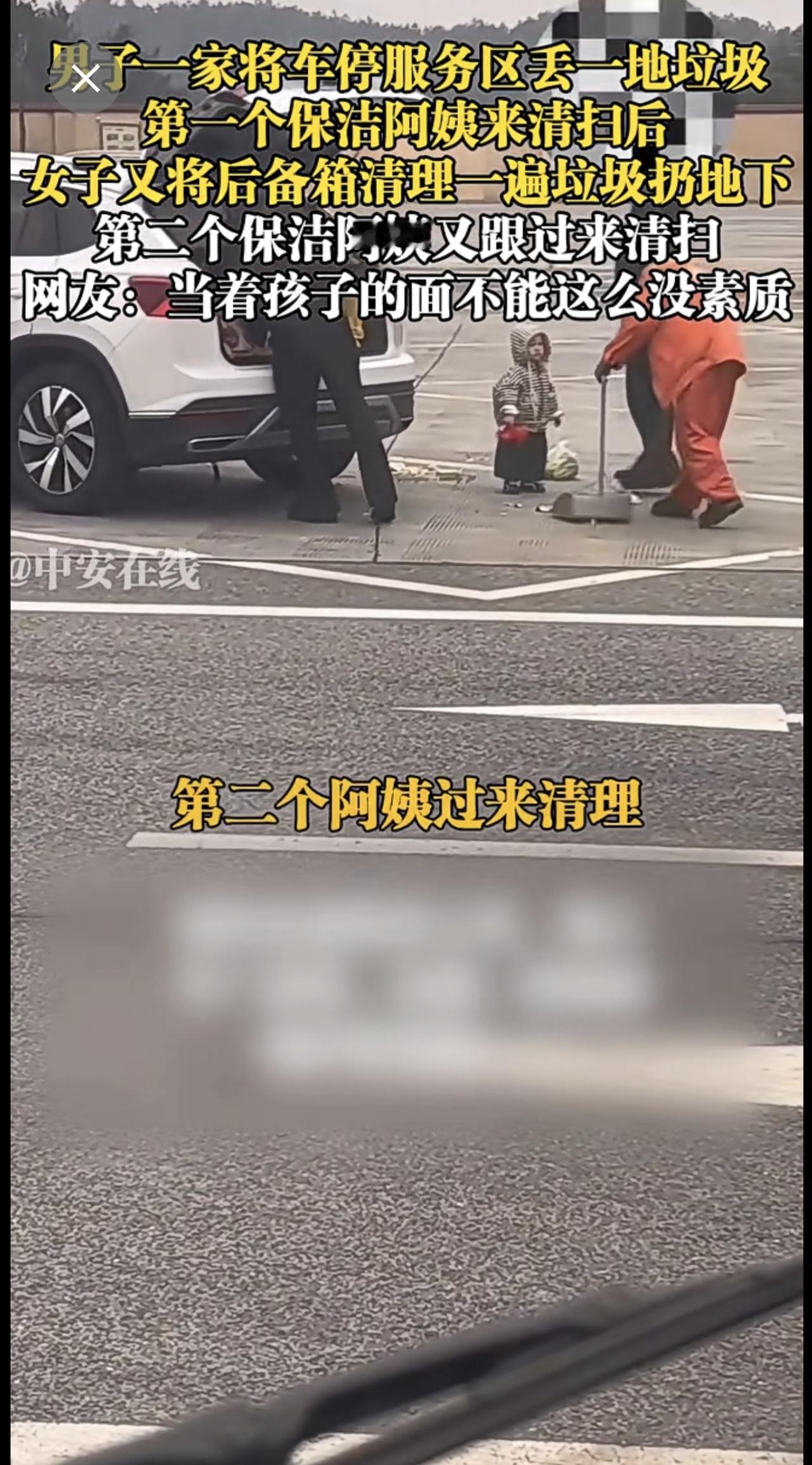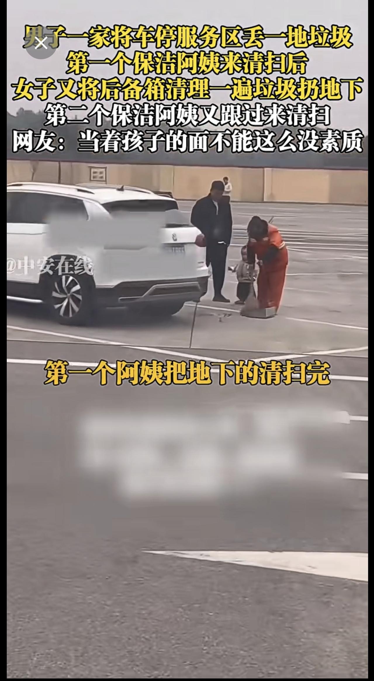 2月5日,广西。男子一家将车停服务区丢一地垃圾,第一个保洁阿姨来清扫后,女子又将后备箱清理一遍垃圾扔地下,第二个保洁阿姨又跟过来清扫,网友:当着孩子的面不能这么没素质 垃圾 服务区 素质 (陈三多)投稿邮箱:3882124142@qq.com;更多视频点击关注@中安在线