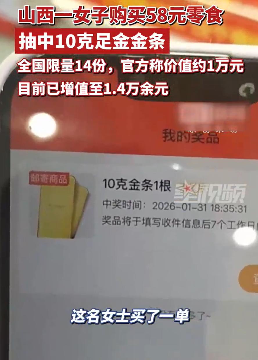 这就是命啊!山西大同,一女子去零食店购物,刚好赶上店里搞活动抽奖,结果女子随手一抽,竟然10克足金金条,而全国也就只有14份,有意思的是,女子还没感觉怎么样,店员却兴奋的连话都说不清楚了 当天,一位穿着红色羽绒服、戴白色头盔的女子,进了一家零食店。她本来只是买点零食,结账时看到店里在搞活动,满58元就能抽次奖,就顺手试了试。没想到这一抽,就中了大奖 按照活动方的说法,这根金条价值差不多一万元。不过最近金价一直在涨,有人估算,现在可能已经值到一万四左右了。这哪是抽奖,简直是理财啊 说实话,这种“随手一抽就是大奖”的事儿,平时我们大多只在网上刷到,总觉得离自己很远。但这位大姐的经历挺真实,她就是日常买点零食,顺手参与一下,没指望真能中。可偏偏就是这种不经意,往往带来意料之外的收获 生活中好多事好像都这样:你越盯着结果,越难如愿;反而放松一点,平常心对待,惊喜说不定就来了。这不是说我们要靠运气活着,而是有时候不必把得失算得太清楚。买零食是为了开心,抽奖也是个乐趣,中了是锦上添花,不中也正常。把心态放平了,日子会轻松很多