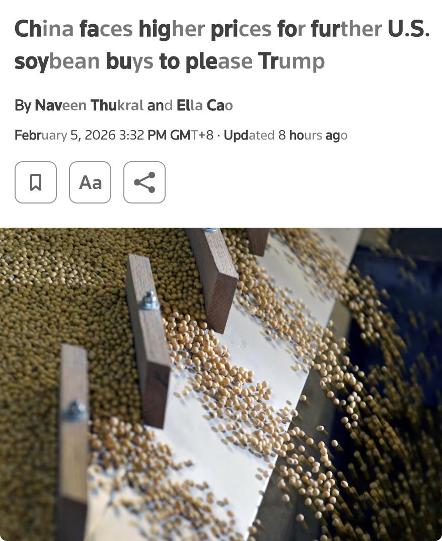 外媒:中国若增购800万吨美国大豆,将面临更高的成本。此前特朗普表示中国正考虑在本季购买2000万吨美豆。 目前美国大豆价格与巴西大豆的价差扩大,美豆4月船期报价比巴西货高约50美元/吨,中国若购买800万吨美豆,将多付约4亿美元。 中国国有粮企已自2025年10月起购买约1200万吨美豆,多支付近1亿美元。由于美国大豆13%的关税高于巴西的3%,私人压榨企业更倾向于购买巴西和阿根廷大豆,且中国日照加工中心的压榨利润自2025年8月起为负。