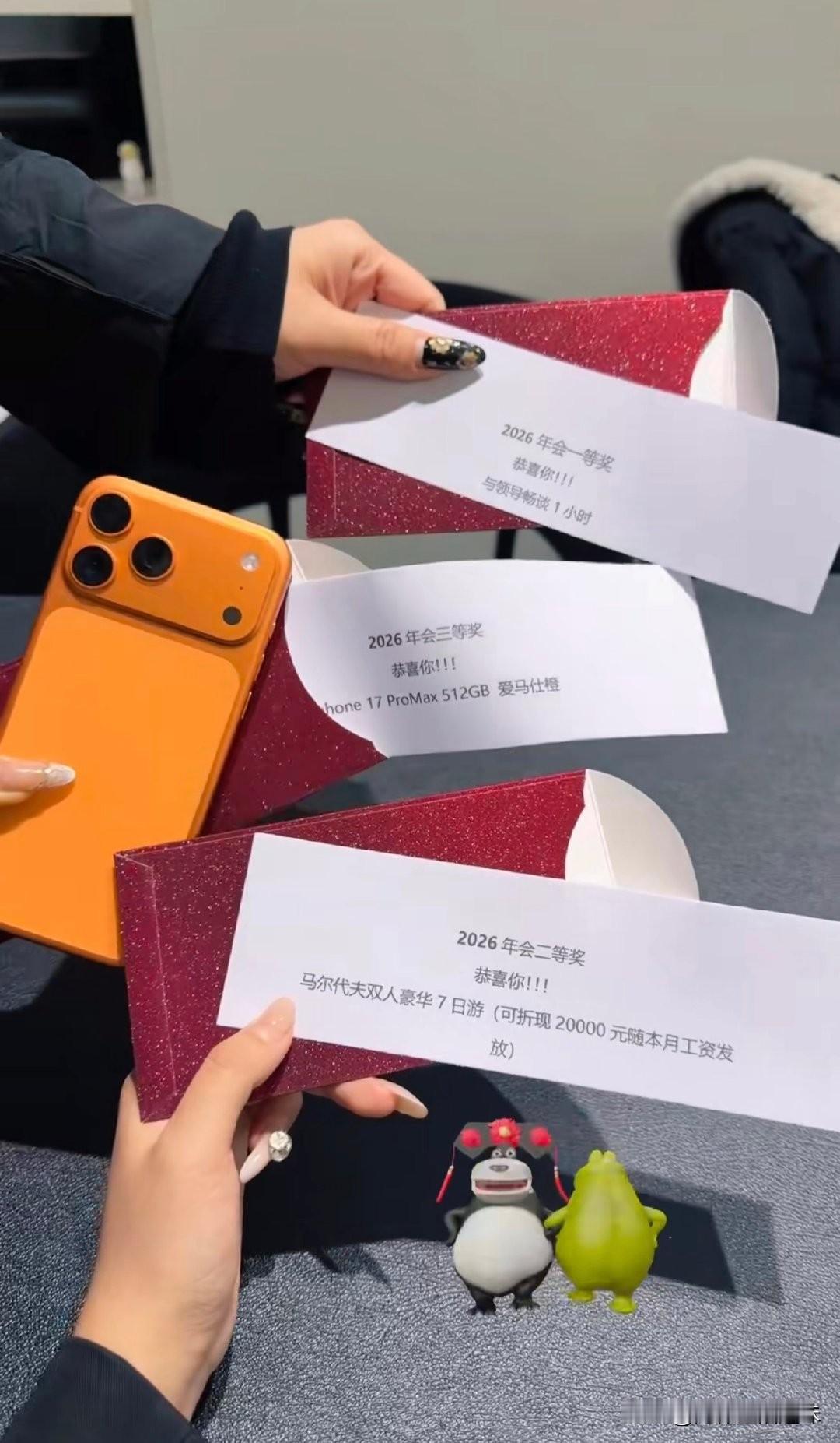 年会公司准备了丰富的抽奖福利 坐在我旁边的同事运气逼人 喜中三等奖 最新款苹果17手机512G的 想着挨着她 我的运气也一定不会差 结果旁边的另一位也是好运爆棚 抽中年会二等奖 喜提马尔代夫双人豪华7天游 公司考虑周到 马上要过年怕抽中的幸运儿不愿去 贴心提示可兑换2000元福气红包 将随下月工资发放 左右两边如此好运 二等奖三等奖名花有主 那么我在她们中间应该不会太差 果不其然 好运来了谁都挡不住 我抽中了年会一等奖 这刻感到自己好运加持 打开一等奖瞬间差点哭晕在厕所 只见一等奖纸条上写着 和领导畅谈一小时 …………