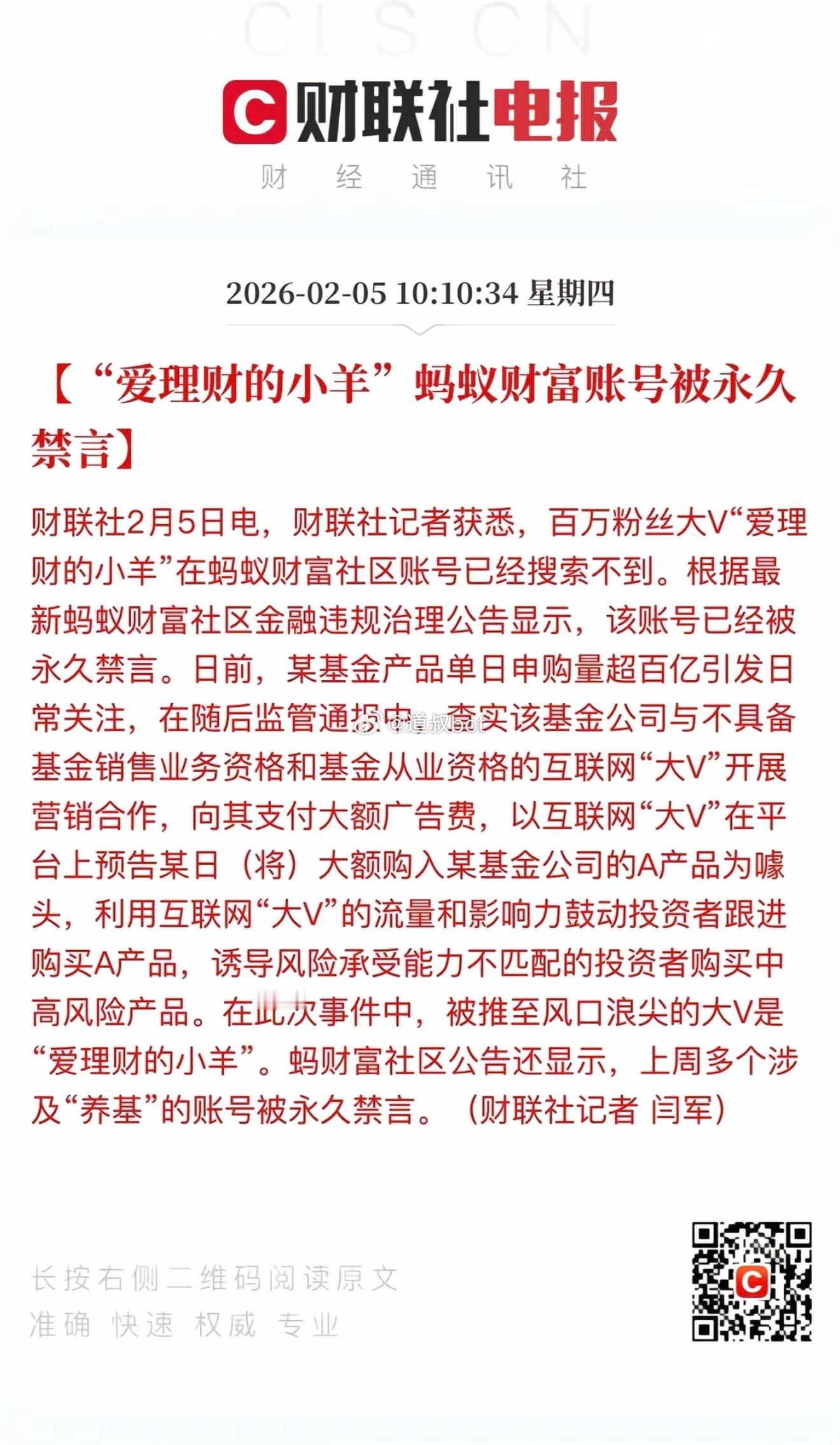 百万粉丝博主“爱理财的小羊”蚂蚁财富账号被永久禁言。