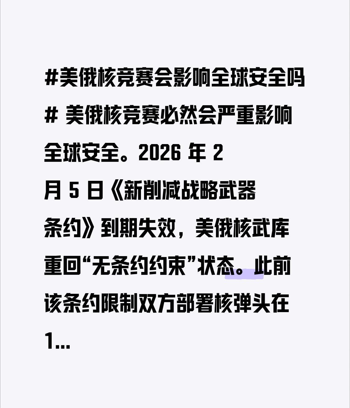 美俄核竞赛必然会严重影响全球安全。2026 年 2 月 5 日《新削减战略武器条约》到期失效,美俄核武库重回“无条约约束”状态。此前该条约限制双方部署核弹头在 1550 枚以内、运载工具不超 700 件。 没了约束,双方大量未部署弹头可能启用,核力量或短期内显著增长。2025 年俄罗斯有 4309 枚核弹头,美国 3700 枚,美约 1770 枚可随时发射。而且竞赛转向新型武器技术,像俄的“海燕”“波塞冬”,美的“金穹”等,旧军控机制“过时”,误判风险加剧,全球安全岌岌可危。