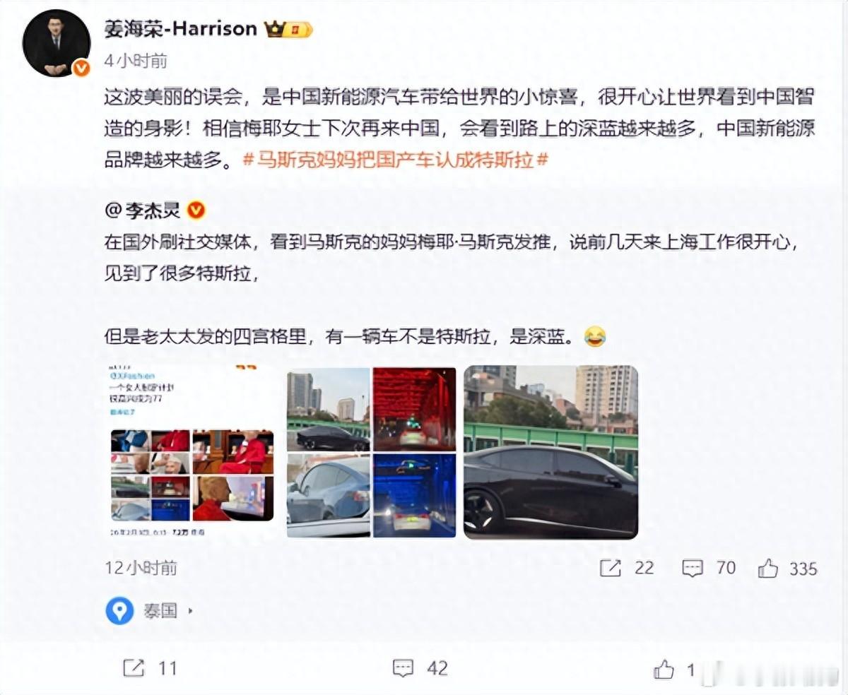梅耶·马斯克居然把深蓝汽车认成了特斯拉!这事儿你们听说了吗?特斯拉CEO的亲妈都能认错车,是不是说明中国新能源车设计真的和国际大牌一样有质感了? 深蓝CEO姜海荣的回应超级大气,说这是“美丽的误会”,还自信表示下次梅耶来中国会看到更多深蓝汽车。这底气来自实打实的销量——深蓝去年卖了33万辆,累计交付破70万,难怪回应这么从容。 这场误会反而成了中国智造最好的广告。车企之间的竞争早就不是单纯拼销量了,更是品牌格局和产品力的综合较量。你们觉得还有哪些中国品牌已经具备和国际品牌同台竞技的实力?来评论区聊聊