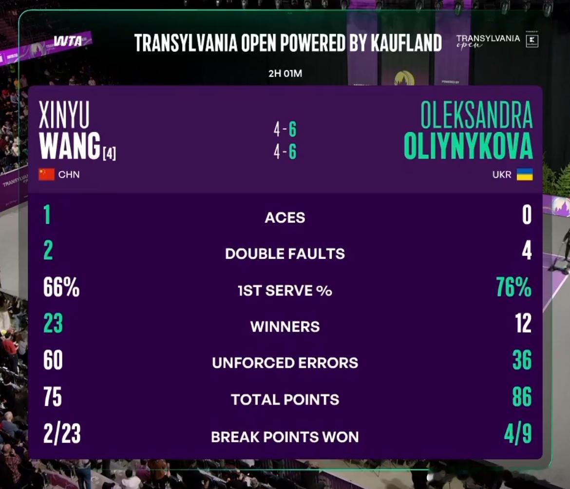 WTA克卢日-纳波卡站1/4决赛,王欣瑜明显身体欠佳,开局就叫了医疗暂停。即使状态不好,但王欣瑜依然有机会获得胜利,全场比赛王欣瑜获得高达23个破发点,但是错失其中了21个。