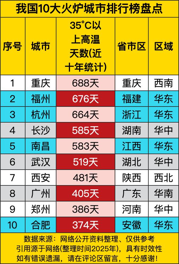 重庆稳稳地坐在榜首,688天的35℃以上高温天数,简直是“热中之王”。都说重庆火锅够火辣,合着这天气更火辣。福州紧随其后,676天的高温,这是在跟重庆争夺“火热宝座”啊。杭州也不甘示弱,664天,感觉这三位都快被太阳宠坏了。 再瞧瞧其他城市,长沙、南昌也都在前列,一个585天,一个583天,这差距小得就像在玩一场高温的拉锯战。武汉519天,同样不好惹。这些城市的热度,就像它们的经济一样,一直居高不下。大夏天的,走在街上,感觉自己都要被融化了,出门就是和高温“Battle”。 还有西安,作为西北的城市,居然也能有481天的35℃以上高温,真是让人刮目相看。广州405天,虽然相对靠后,但架不住它本身就是个“大火炉”,湿度一加上去,那种闷热简直能把人逼疯。郑州386天,合肥374天,也都在高温的行列里。 咱就说,住在这些火炉城市的友友们,真的是太不容易了。空调得24小时连轴转,不然根本扛不住。这夏天啊,对他们来说,可能就是一场漫长的“烤验”。不知道以后能不能发明点啥高科技,让这些城市凉快凉快,不然大家夏天可咋过哟!