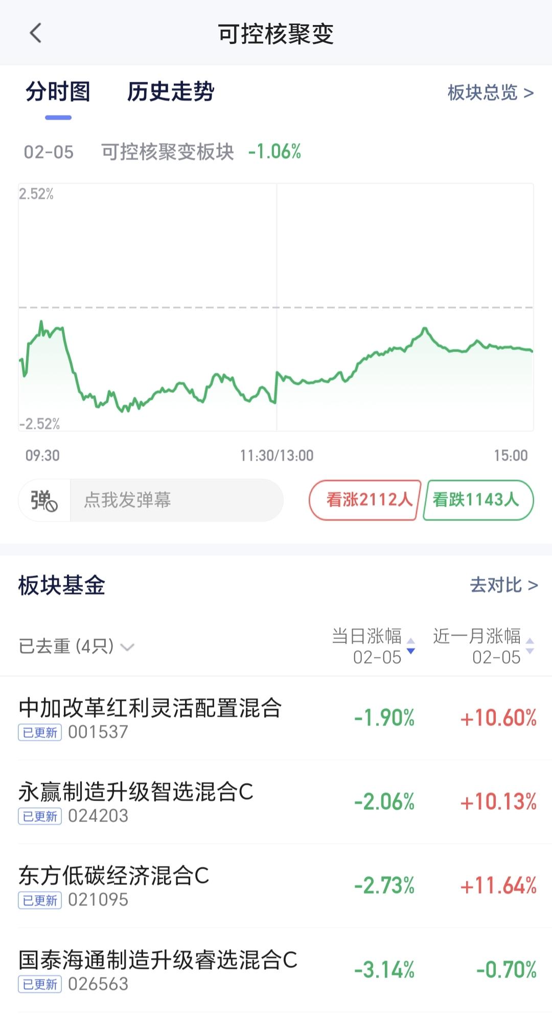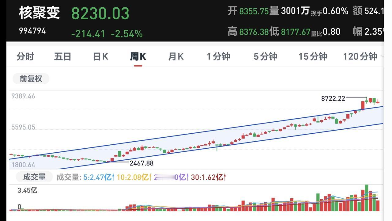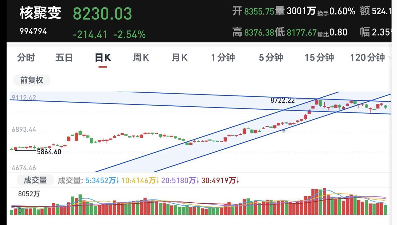 基金:可控核聚变板块应该怎么办 持有的可控核聚变板块基金,昨天晚上净值更新下跌了2.06%,基金持有184.68元,持有亏损5.32元,持有亏损率2.96%,见下面的截图1。 这只基金我也是从最高点开始定投进场,每天的定投额度是10块钱,开始的时候没有底仓,因为,我知道当时是处于高危区域,那个时候开始定投,就是为了能够观察这只基金。 看下面的截图5,这是可控核聚变板块日K线图,现在的位置处于日线级别短期下跌通道中,近期观察能不能上涨突破这个下跌通道的上轨线,会不会下跌跌破这个下跌通道的下轨线。 看下面的截图6,这是可控核聚变板块周K线图,现在的位置处于上涨通道的上方,还没有完成上涨通道的回归,这样的情况之下,我暂时都不会考虑手动进场,就这样每天10块钱定投,如果将来完成了上涨通道的回归,再观察有没有可以考虑进场的机会。 对于热门板块,只有经过充分的调整之后,才可以考虑要不要进场,很多人在刚刚开始调整的时候,就急急忙忙进场,最大的可能性是被挂在山顶上,上涨幅度越大的板块,调整起来也会更加的猛烈,这几天的走势就让大家认识到了这一点。 花一秒钟点赞,花30秒钟评论,就是对我最大的支持,谢谢大家的支持。