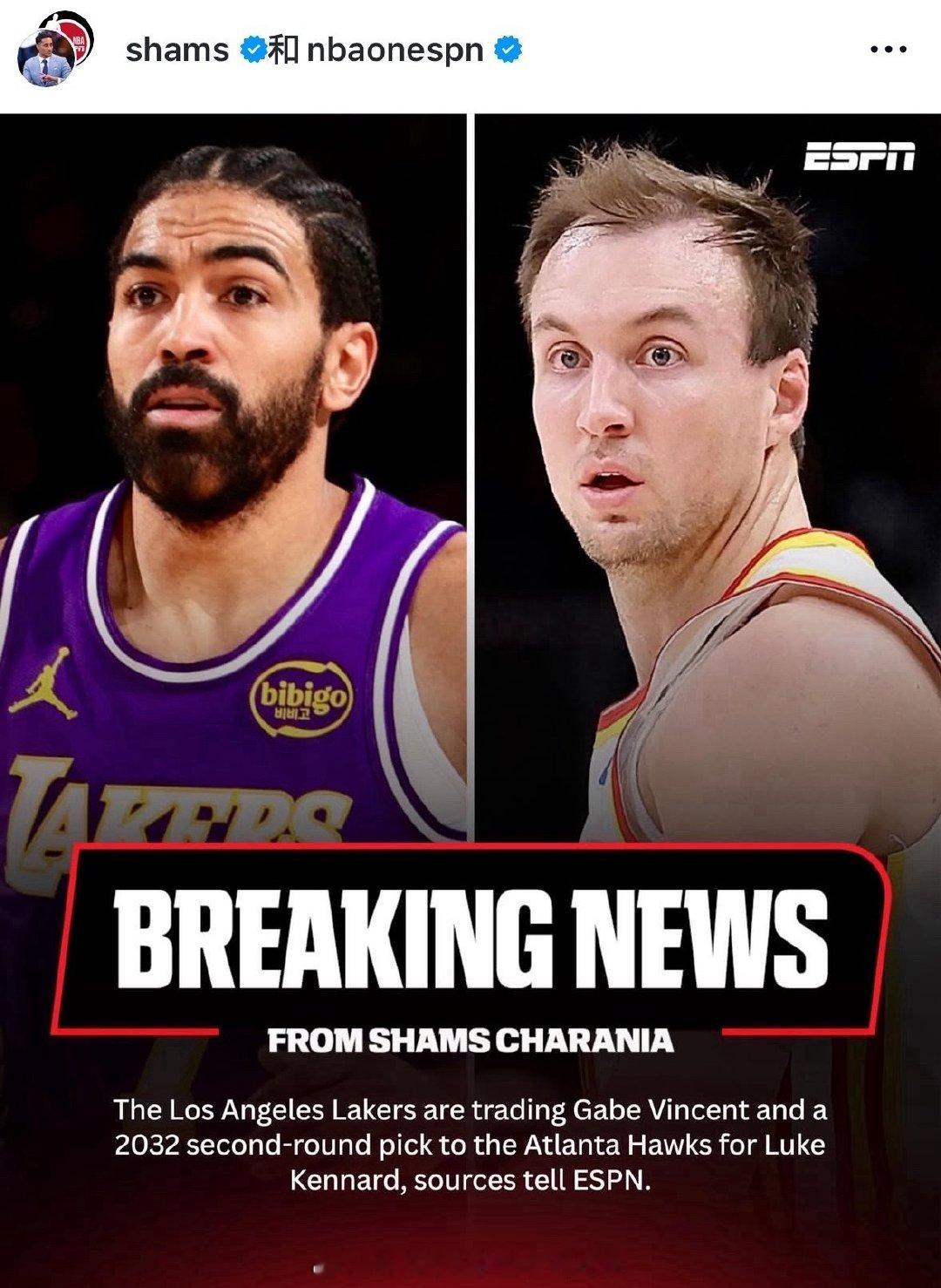 Shams:湖人将文森特和2032年次轮签送至老鹰,换取肯纳德!🔥🔥🔥肯纳德加盟湖人 湖人老鹰交易 (