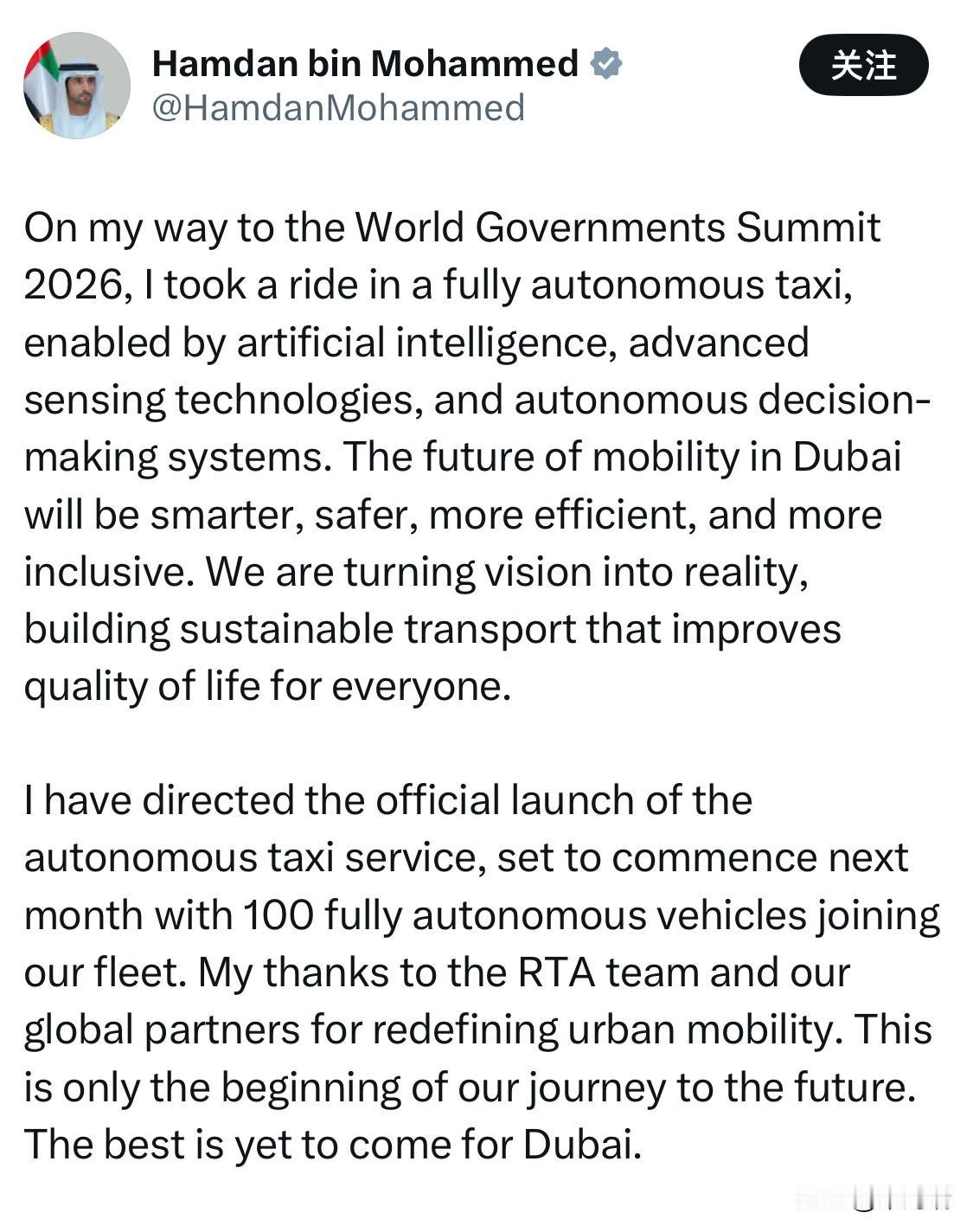 迪拜王储谢赫·哈姆丹·本·穆罕默德亲王(Sheikh Hamdan bin Mohammed)在X平台分享了乘坐百度阿波罗智行 (Baidu Apollo Go) 的 RT6 自动驾驶出租车的体验: 在前往2026年世界政府峰会的途中,我乘坐了一辆完全自动驾驶的出租车,它融合了人工智能、先进的传感技术和自主决策系统。迪拜的未来出行将更加智能、安全、高效和包容。我们正在将愿景变为现实,打造可持续的交通系统,提升每个人的生活品质。 我已正式启动自动驾驶出租车服务,该服务将于下月正式上线,届时将有100辆全自动驾驶车辆加入我们的车队。感谢迪拜道路交通管理局(RTA)团队和我们的全球合作伙伴,他们重新定义了城市出行方式。这仅仅是我们迈向未来的开始。迪拜的未来一片光明。 迪拜王储谢赫·哈姆丹·本·穆罕默德亲王(Sheikh Hamdan bin Mohammed)在前往2026年世界政府峰会的途中乘坐了这辆车,标志着迪拜官方启动了其无人驾驶出租车服务。 合作方: 迪拜道路运输管理局 (RTA) 与百度阿波罗智行合作实施该项目。 启用时间: 迪拜的无人驾驶出租车服务计划于2026年3月正式向公众推出。 车队规模: 首批将有100辆全自动驾驶汽车加入车队,目标是在未来几年内将车队规模扩大到1000多辆。 技术特点: 这些车辆搭载了40多个传感器,包括激光雷达、雷达和摄像头,并由人工智能系统驱动,确保在复杂的城市环境中安全运行。