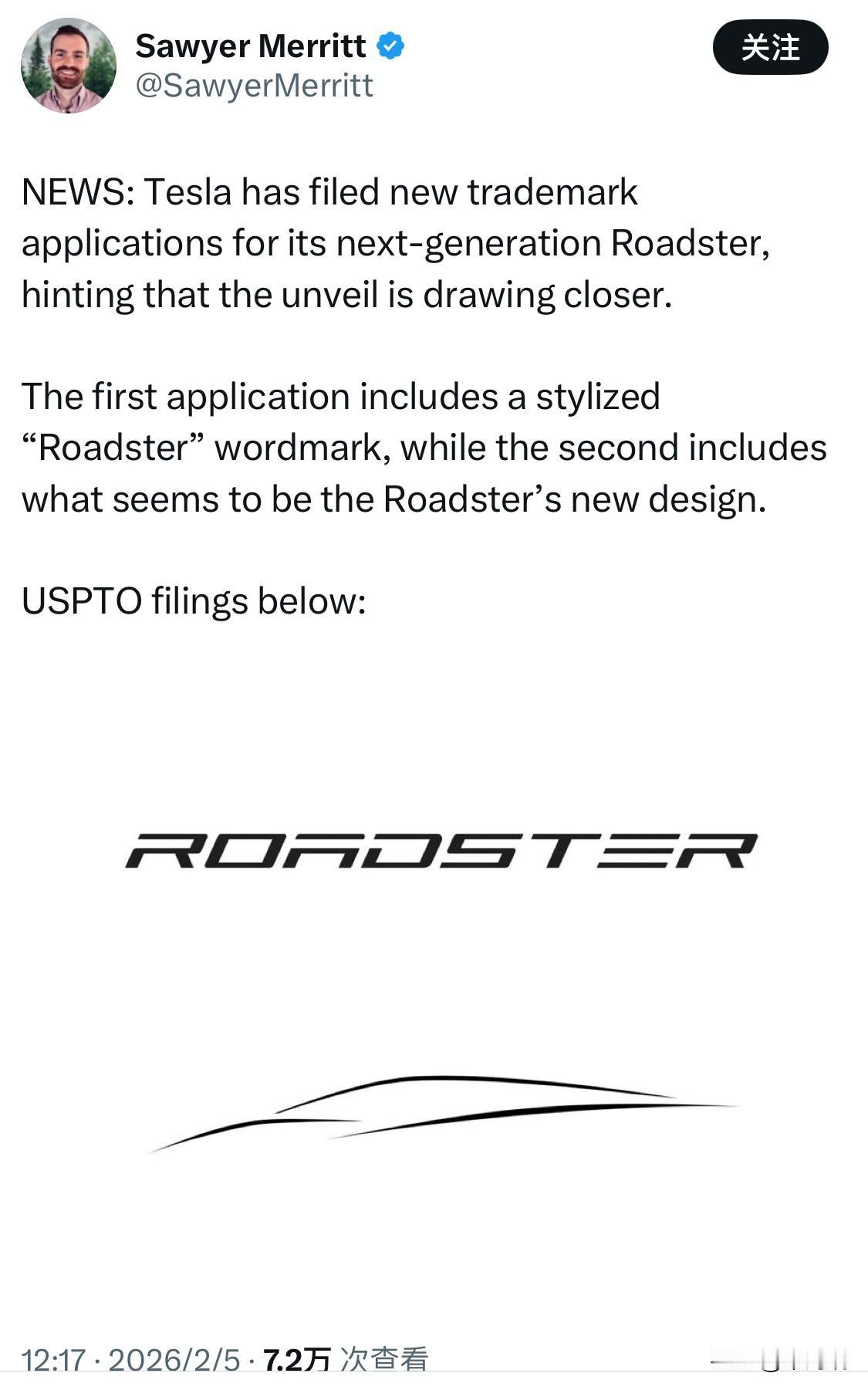 特斯拉新闻:特斯拉为其下一代 Roadster 跑车提交了新的商标申请,暗示该车型的发布日期越来越近了。 第一份申请文件包含一个风格化的“Roadster”字样商标,而第二份申请文件则包含了Roadster的新设计。 新商标申请详情 (2026年2月) 全新徽标设计:其中一项申请涉及一个新的视觉标志,由三条极简主义的曲线组成,其轮廓被认为暗示了新款跑车的流线型车身设计。 字体样式更新:另一项申请则是针对“ROADSTER”字样的全新艺术化字体设计,采用全大写样式,字母经过拉伸和分段处理。 品牌保护:分析认为,这些申请旨在保护特斯拉的知识产权,并可能用于未来的线上推广和实车装饰。 下一代 Roadster 发布计划 演示日期:埃隆·马斯克(Elon Musk)表示,特斯拉计划于 2026年4月1日 举行新款 Roadster 的演示活动。 设计巨变:马斯克透露,量产版的设计将与 2017 年首次展示的概念版本“非常不同”。 量产时间:预计在 2026 年 4 月演示后的 12 至 18 个月内开始量产,这意味着交付可能要等到 2027 年至 2028 年。 性能目标:目前该车仍以 0-60 英里/小时加速少于 1.9 秒及超过 250 英里/小时的最高时速为开发目标。