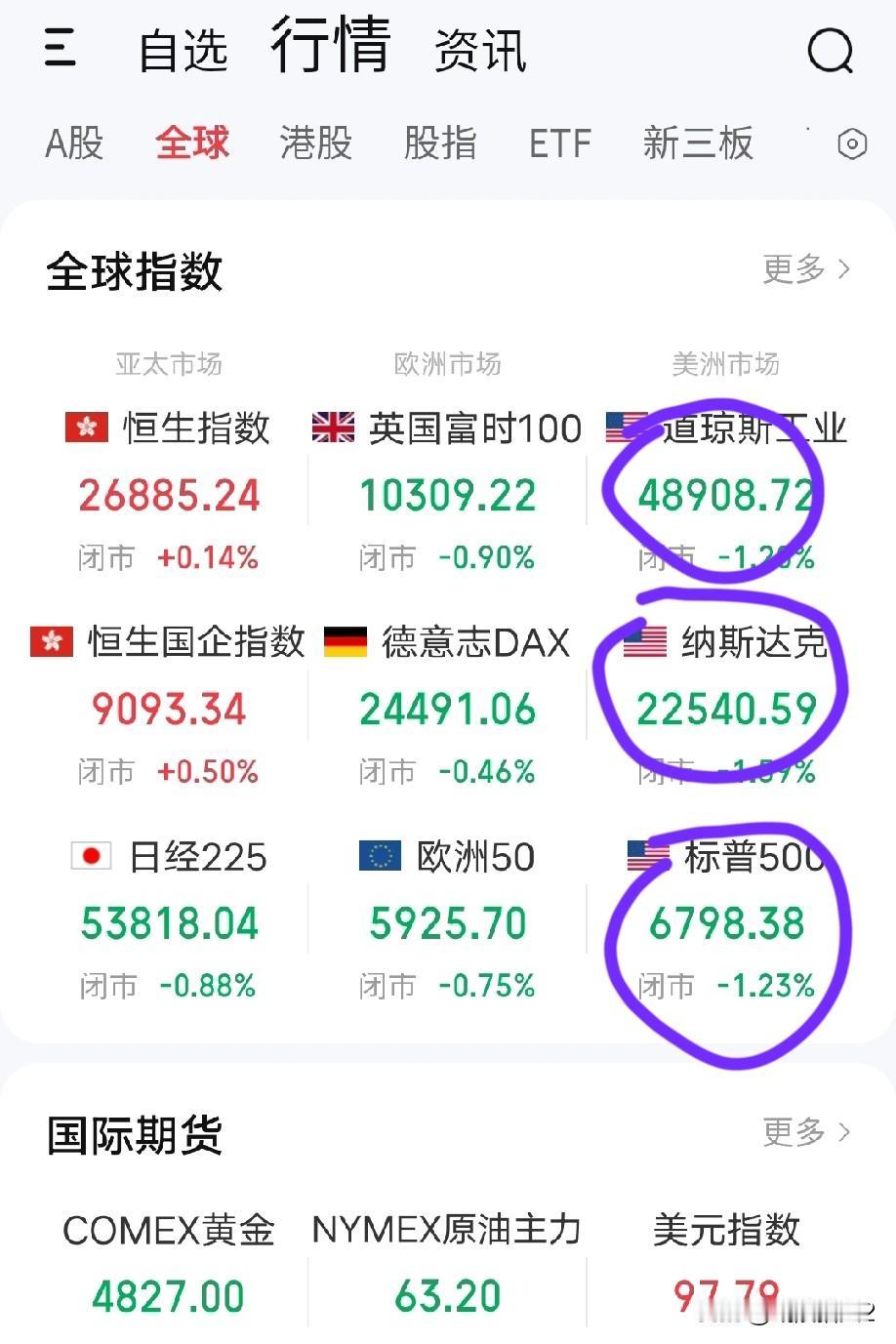2月6日早评。情况非常不妙,全球股市哀鸿遍野,隔夜欧美股市一片碧绿,美股三大指数再次全线大跌(图1、2、3),纳斯达克指数首当其冲,最大跌幅达到1.94%,仿佛万丈高楼一脚蹬空,扬子江心断缆崩舟。 这不是夸张的说法,因为昨晚的下跌,美股泥沙俱下,科技股(包括存储芯片、AI应用、软件开发)和资源类大宗商品(包括贵金属、有色、小金属)等题材全面熄火,就连前两天热门的光优板块也大跌2.5%(图5)。整个美股再无叙事逻辑,故事全部讲完。 回到A股,情况惊人相似,昨天科技、资源美商品、商业航天和光伏也是全线下跌,资金在实在无处可去的时候涌向了老登股,大家看一看昨天涨幅榜前10的都是些什么板块(图6)?银行、商业百货、服装、房地产、食品饮料等等,这些可都是奶奶级的老货,市场资金真的被逼得走投无路了。 一般而言,如果长期滞涨的板块开始补涨的时候,那么一轮行情就要结束了。这当然不是大家希望看到的。目前A股市场的热度降到了55℃(图4),从前期的98℃降温降到现在,应该可以了,再降就是往冰箱里送的节奏,那意味着什么大家心知肚明。 问题出在:前期热点题材被全面打压熄火的状况下,市场资金并不喜欢老登股,宁愿空仓也不去,导致成交量大幅萎缩。大家都希望节前能有一个红包行情,关键问题是凭这些老登股的业绩,发不出那么多红包。 管理层想要有长者风度、体谅一下散户的不易,近日必须放一下前期的热门板块,主要是科技方向,给大家实实在在发个红包,欢欢喜喜过个年。所以,今天大家关注科技方向(包括芯片半导体、AI应用、高业航天等等),如果有戏,那么要发红包了。 这里,毗陵猎人先给管理层拜个早年啦,这可不是马年拍马屁,而是希望管理层能给个红包哦!同时,祝广大散户朋友今日好运,新年快乐!