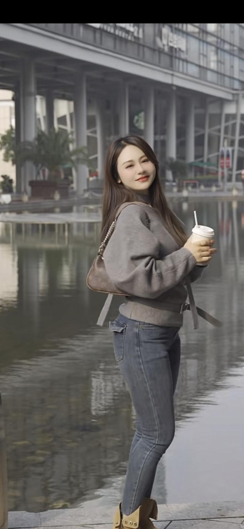 都市女孩的悠闲时光,手捧咖啡,漫步河畔。