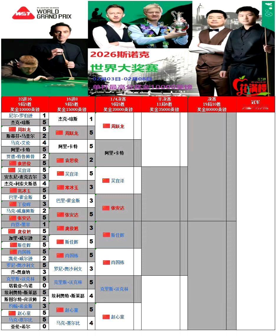 斯佳辉淘汰庞俊旭,临时排名升至第17,由于奥沙利文宣布退出球员锦标赛,所以他很有希望压哨晋级球员锦标赛。周跃龙排名依然是第16。 但是后面还有追兵,赵心童、卡特、张安达。 赵心童惊险绝杀塞尔比,排名升至第18,卡特击败袁思俊升至第19。 1/4决赛,谁胜谁就有希望拿到球员锦标赛资格。 张安达条件最苛刻,要晋级决赛才有希望。