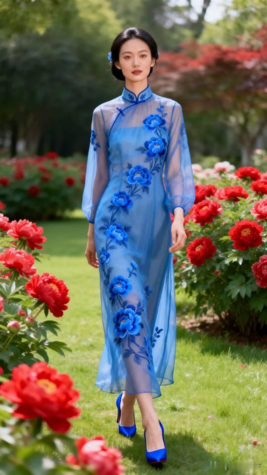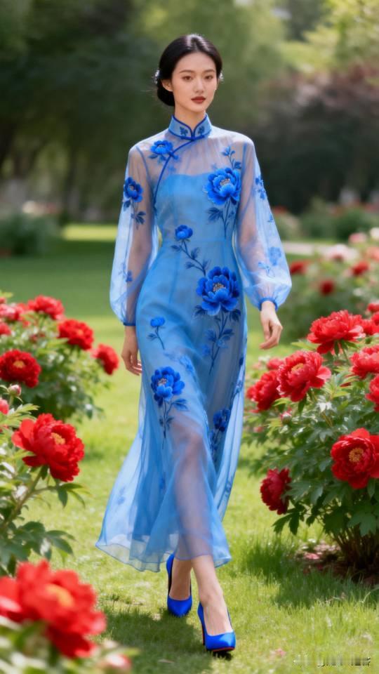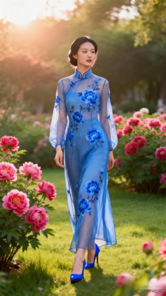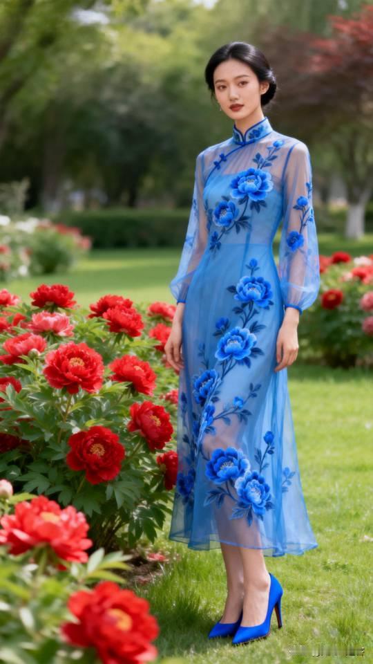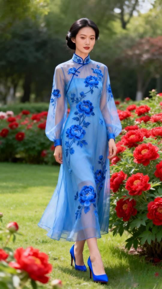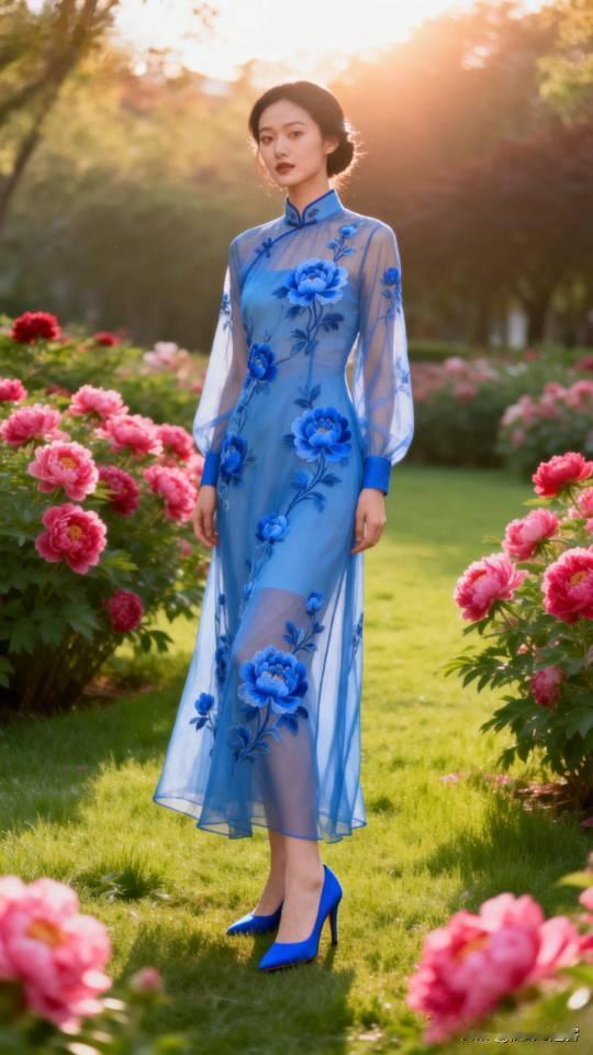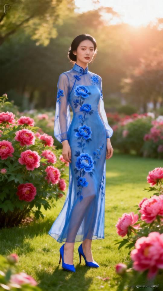 蓝色连衣裙女子在牡丹花丛中留影。连衣长裙旗袍裙
