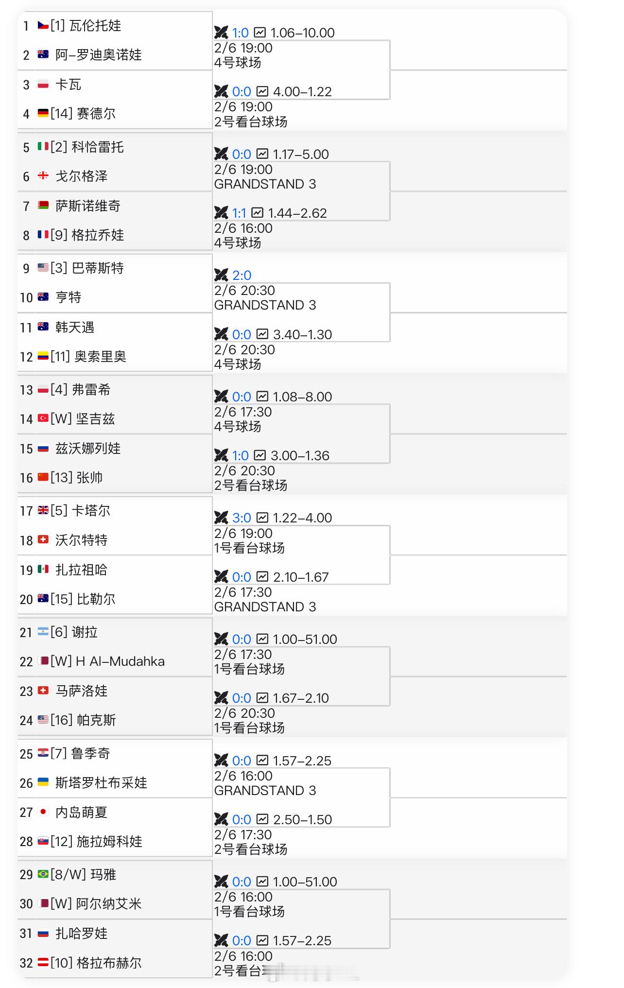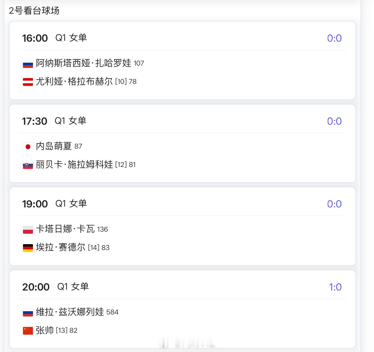 多哈女单资格赛签表🇨🇳张帅vs🇷🇺兹沃娜列娃,预计今晚20:30开打