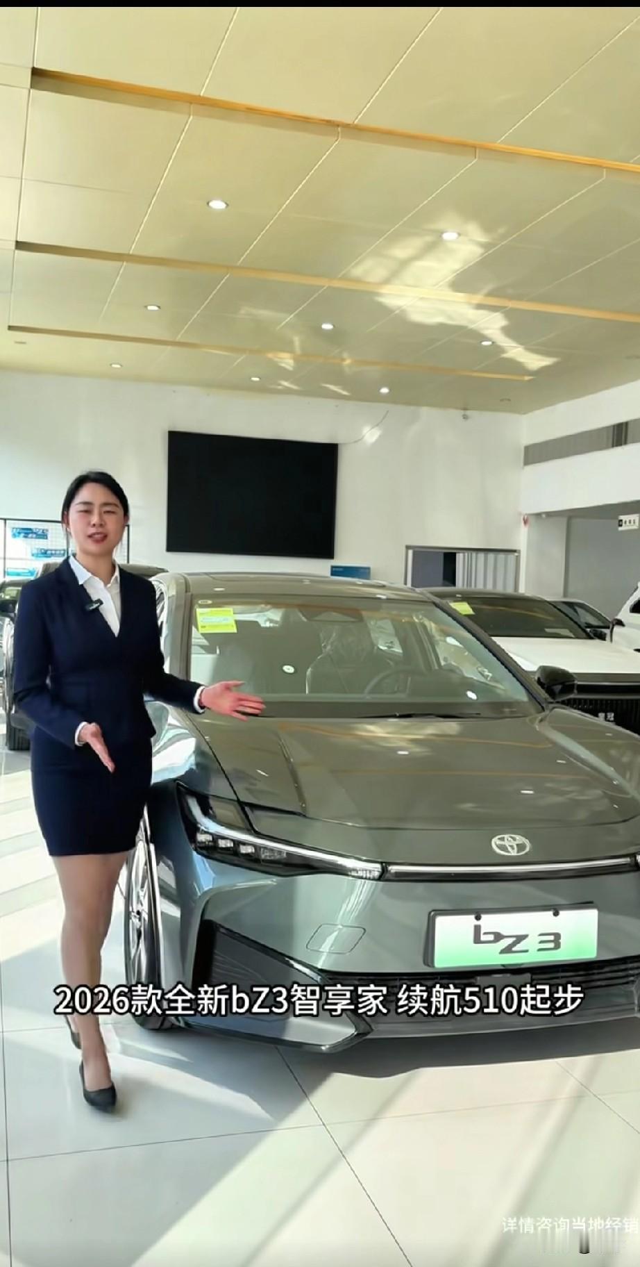 刷到一个视频,标准美女销售介绍丰田bz3智享家,自带气场! 她首先介绍了2026款最新的bz3智享家,说她延续了丰田的一贯美学,这辆车非常耐看! 其次就是它的内饰,非常的舒适,话还没说完自己就坐上去了,可以说她非常喜欢这辆车了! 她介绍的这辆车有氛围灯,可以给大家带来非常好的观影感受,并且拨片挂挡非常爽! 最后她介绍了这辆车的尾灯,说这是贯穿式尾灯,非常的高级,耐看!最后她告诉大家,目前换车价9.38万元! 可以说是最大的优惠了,喜欢的朋友可以考虑买丰田Bz3智享家,大家觉得她介绍的怎么样?