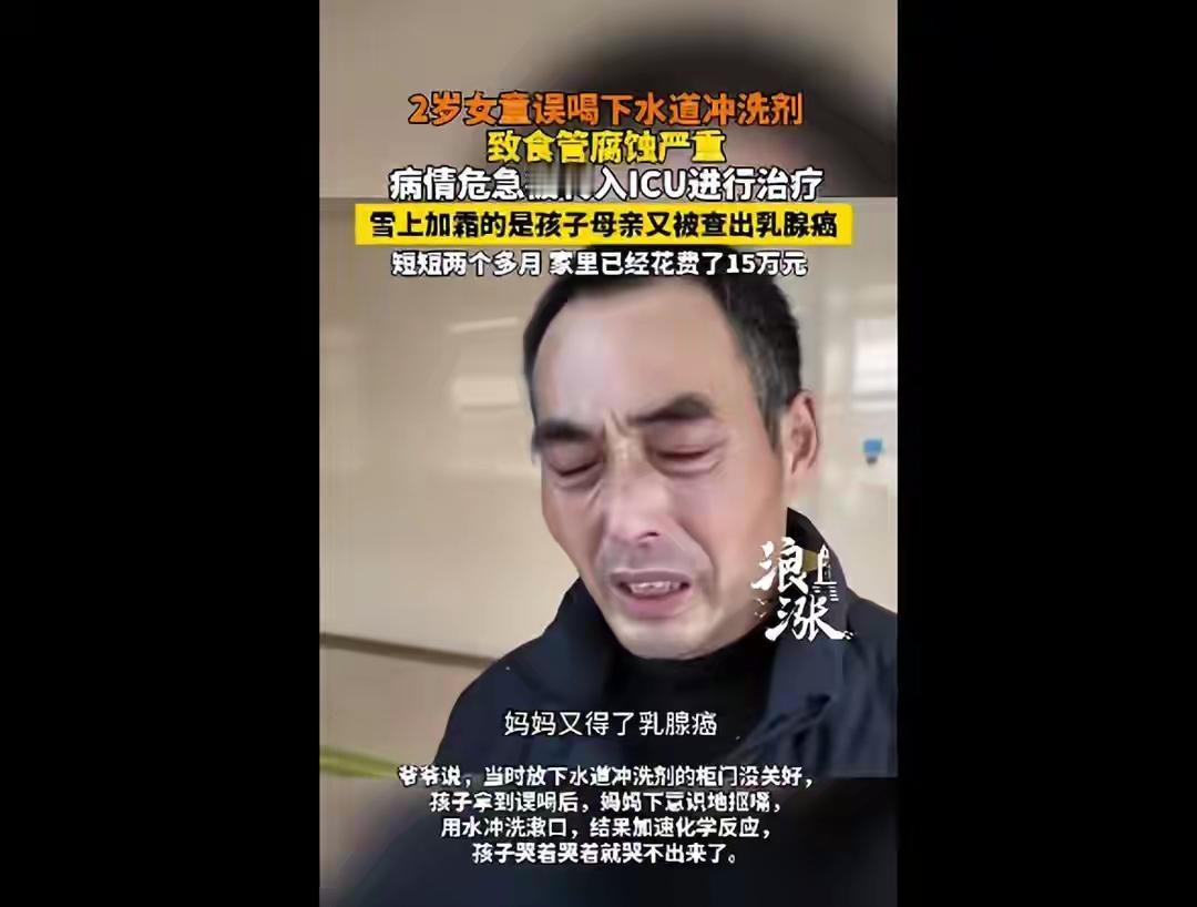 2月4号河南新乡滑县一个2岁女孩误喝了管道清洗剂,清洗剂有强酸给女孩的食道造成严重腐蚀,孩子两度送到ICU病房抢救,爷爷在ICU病房守了两天两夜后悔放清洗剂的柜子没有关好,女孩的母亲今年才29岁己经是乳腺癌晚期,这家真的是屋漏偏逢连夜雨,老天爷什么时候保在他家一下。