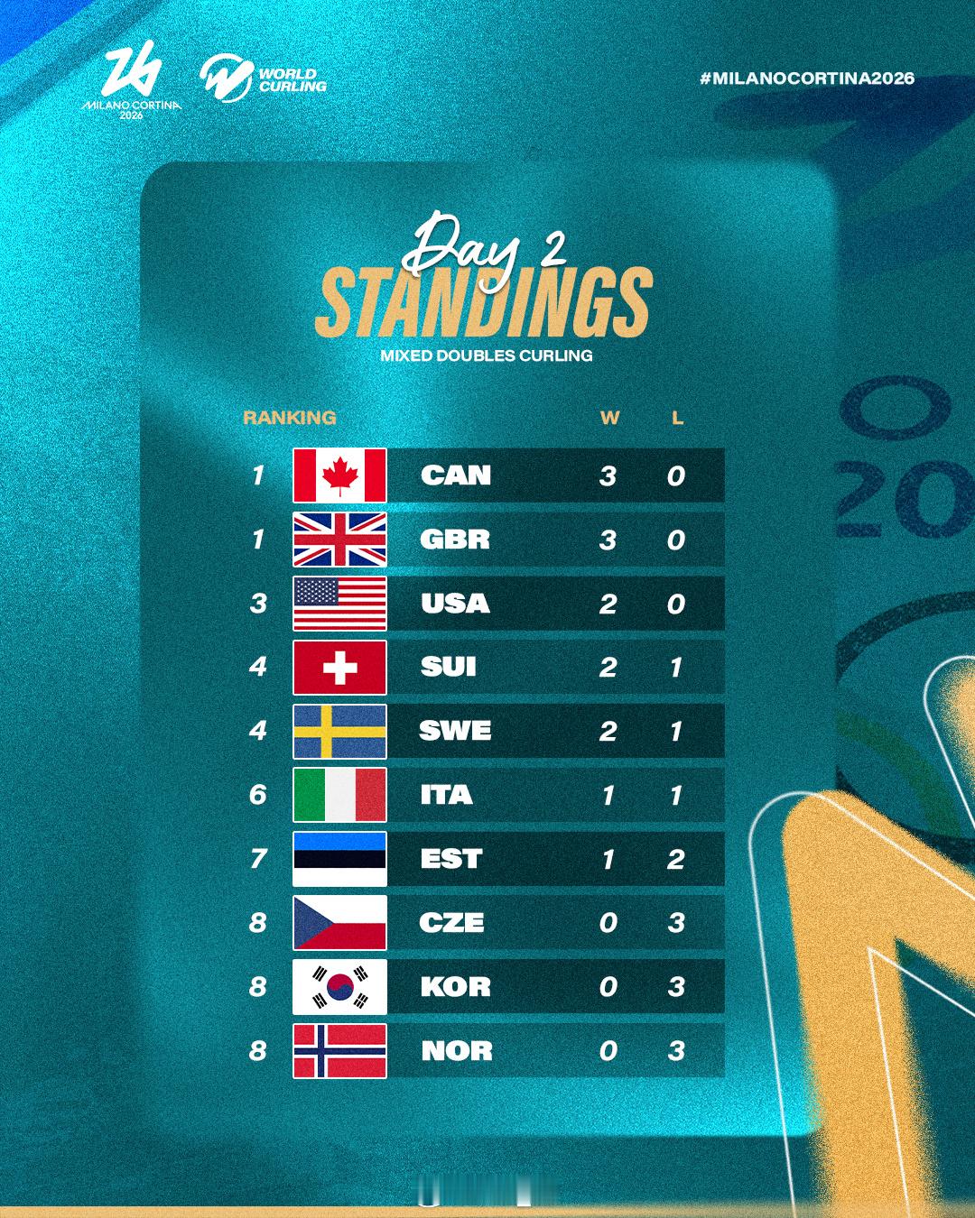 2026年米兰科尔蒂纳冬奥会 今晨混双第四轮赛果🇬🇧 8-7 🇨🇿🇪🇪 7-5 🇸🇪🇨🇭 8-5 🇰🇷🇨🇦 7-2 🇮🇹