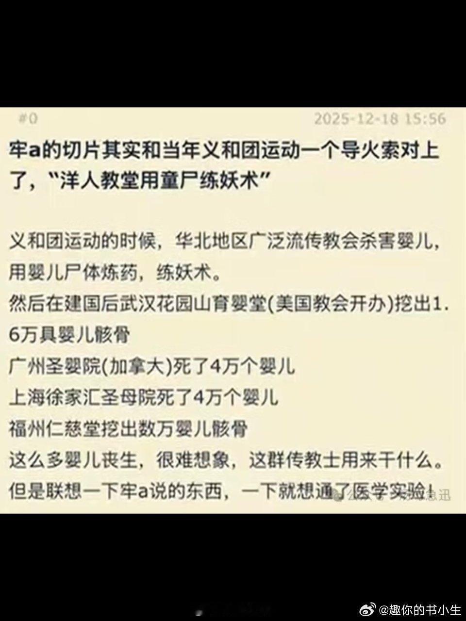 1951年人民政府在武汉花园山育婴堂旧址挖出的1.6万具婴儿骸骨;上海徐家汇圣母院育婴堂1936-1949收养超4万婴儿,仅存活197人,死亡率高达99.5% 广州圣婴院1949年收2216名儿童,政府接收时仅剩48名女婴,其余全部“夭折”,福州仁慈堂从1928-1949收养了30000+孩童,死亡率高达97.7%...