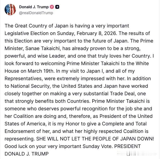 川普表态支持日本首相高市早苗 日本首相高市早苗将于3月19日前往白宫。 日本首相高市早苗已经证明自己是一位强大、有力且睿智的领导人。