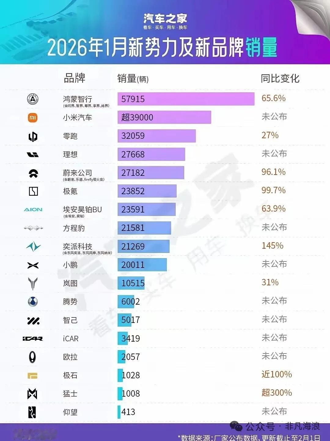 东风公司1月销售汽车18.5万辆,同增29.5%;其中,新能源汽车销量8.3万辆,同增112%;自主品牌销量12.3万辆,同比增长75%。 各单元同比增长排名…… 东风猛士1月销量1008辆,同比增长超300%。 东风风行1月销量同比增长182%。 郑州东风1月销量同比增长146%。 奕派科技1月销量21269辆,同比增长145%。 岚图交付量10515辆,同比增长31%。 神龙同比增长16% 东风日产45984辆,同比增长5.4%。 东风本田31377辆,同增4.4%,环增长1.8%。 其他东风持股差异化品牌车系和卡车单元也可以在单独渠道查询,迷彩车型销量未知。 2026年新品即将列队上市——奕境、岚图珠峰、岚图FE、岚图泰山X8、风行星海V6、风神L9、猛士襄阳U系列、奕派大SUV、纳米corss、奕派固态电池车型、东风郑州NV200、郑州日产SUV、东风日产NX8、神龙新品、东本新品等。 值得一提的是,1月东风奕派纳米06获评“世界十佳汽车智能座舱”东风奕派eπ007+获评“第七届世界十佳智能汽车”,技术实力获行业高度认可。 [太阳][太阳][太阳] 长安集团总公司1月交付170831辆。 其中长安汽车股份,1月销量13.47万辆,同比下降51.14%。其中,新能源汽车销量36621辆,同比下降45.74%。 阿维塔销量,目前没有单独公布!