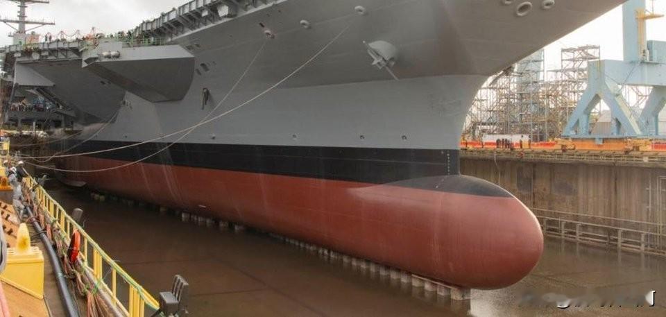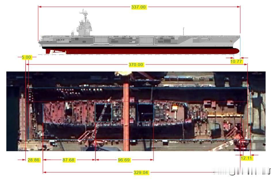 这个船坞总长370米,不过卫星图拍摄角度有点倾斜——画面里船坞上下边缘的投影能差出5米左右。 目前舰尾离船坞后壁大约28.86米,而舰艏下方起支撑作用的墩子,离前壁还有12.11米。参考福特级的设计,这类墩子通常会一直铺到球鼻艖的水平段尽头,舰艏最尖端再往前延伸约10.77米。004型稍大一些,我们不妨估算成11米。 这样一来,目前能看到的船体部分,长度大约是329.04米,再加上舰艏那截“隐藏”的11米,总长就接近340米左右了。 不过舰尾是不是还藏着未组装的模块?这可就说不准了,也许整体长度还会再增加一点。