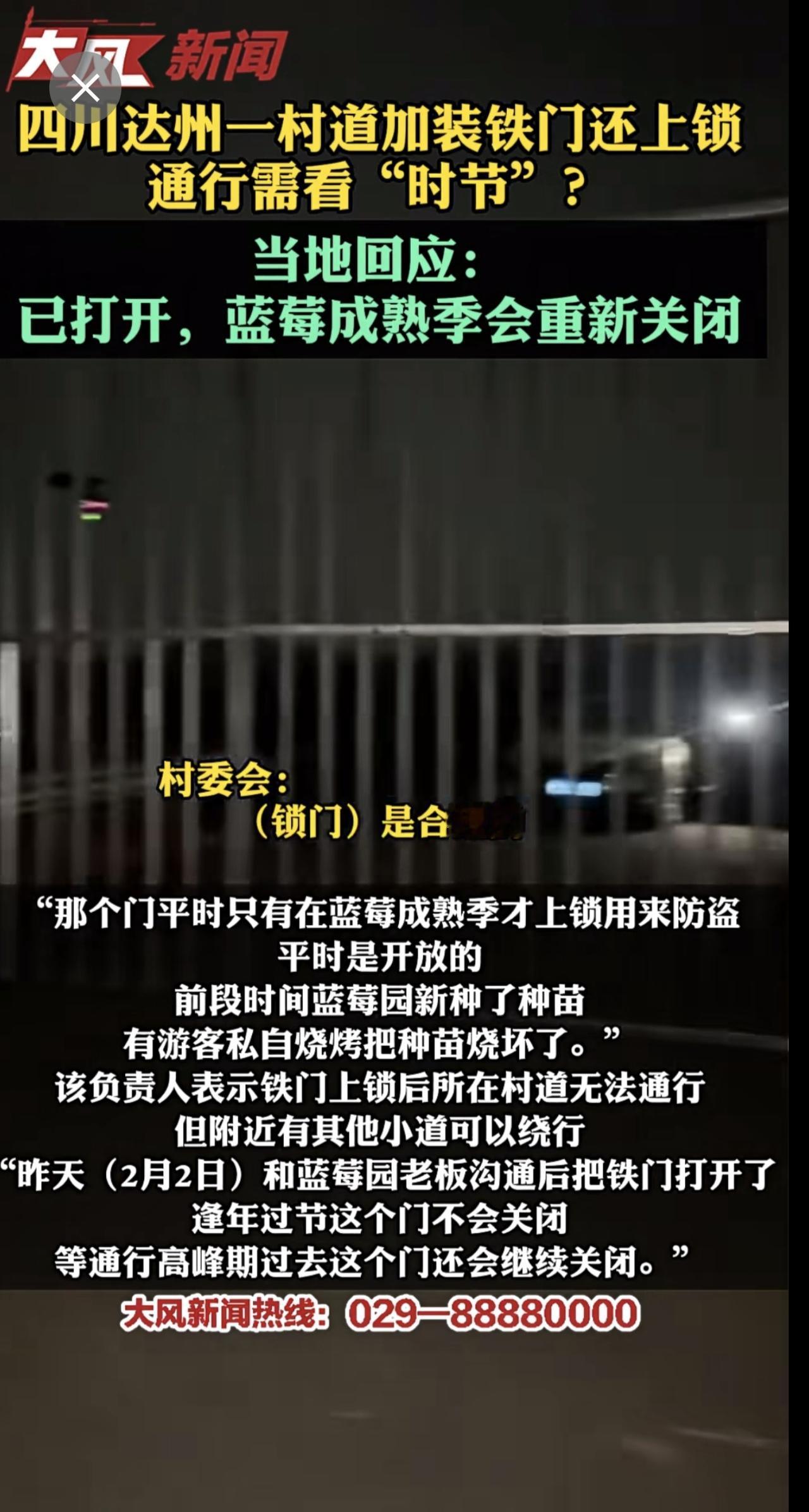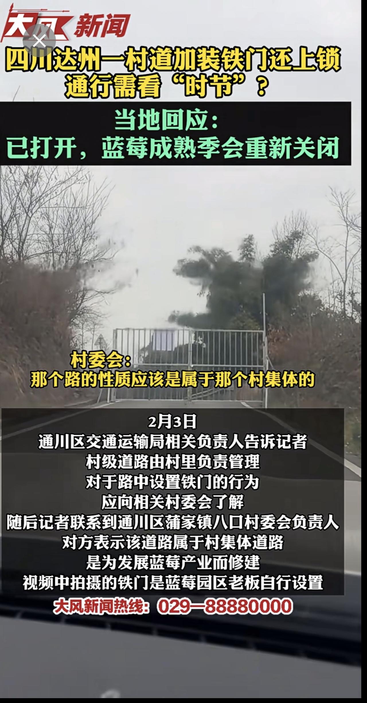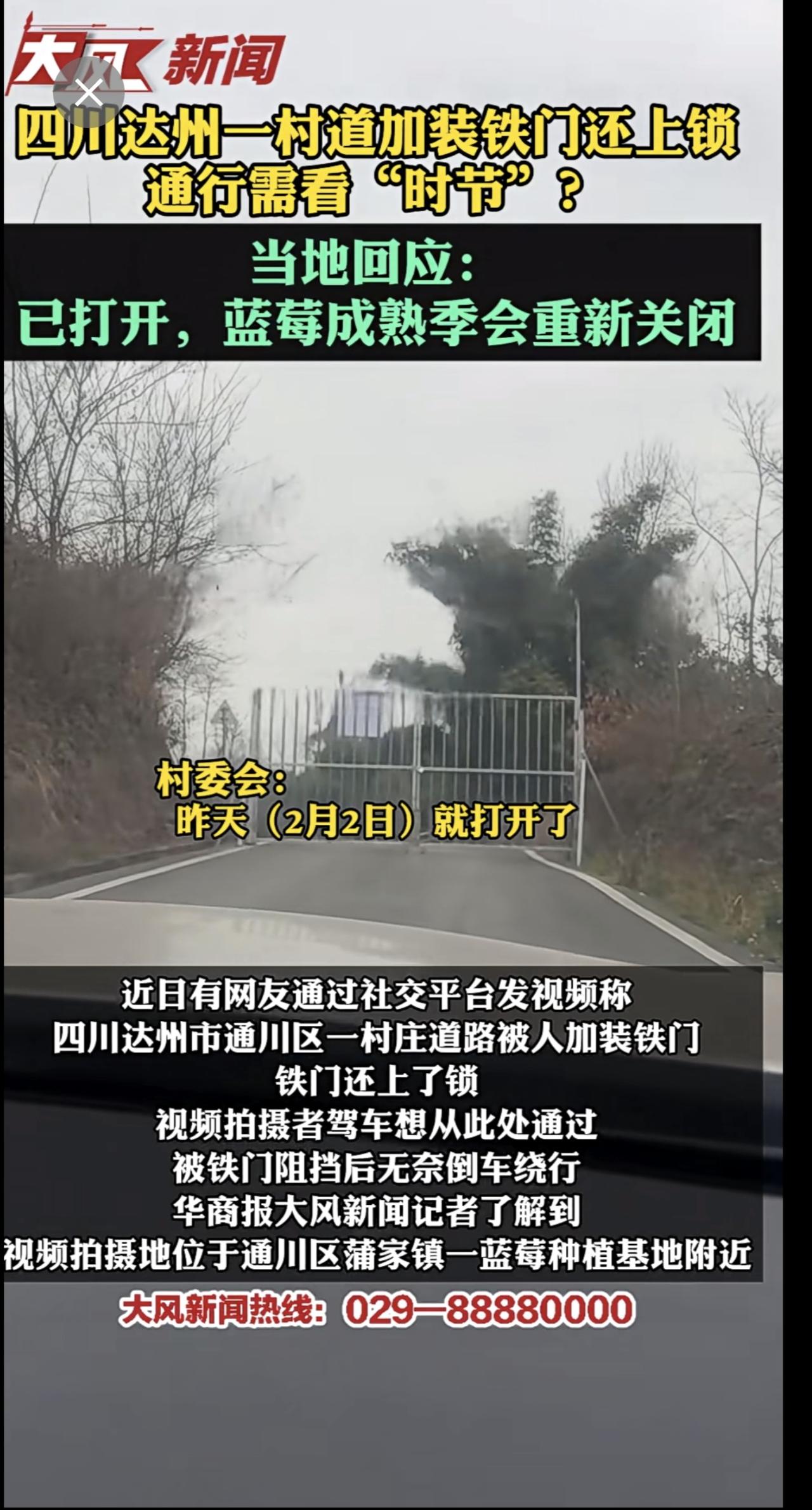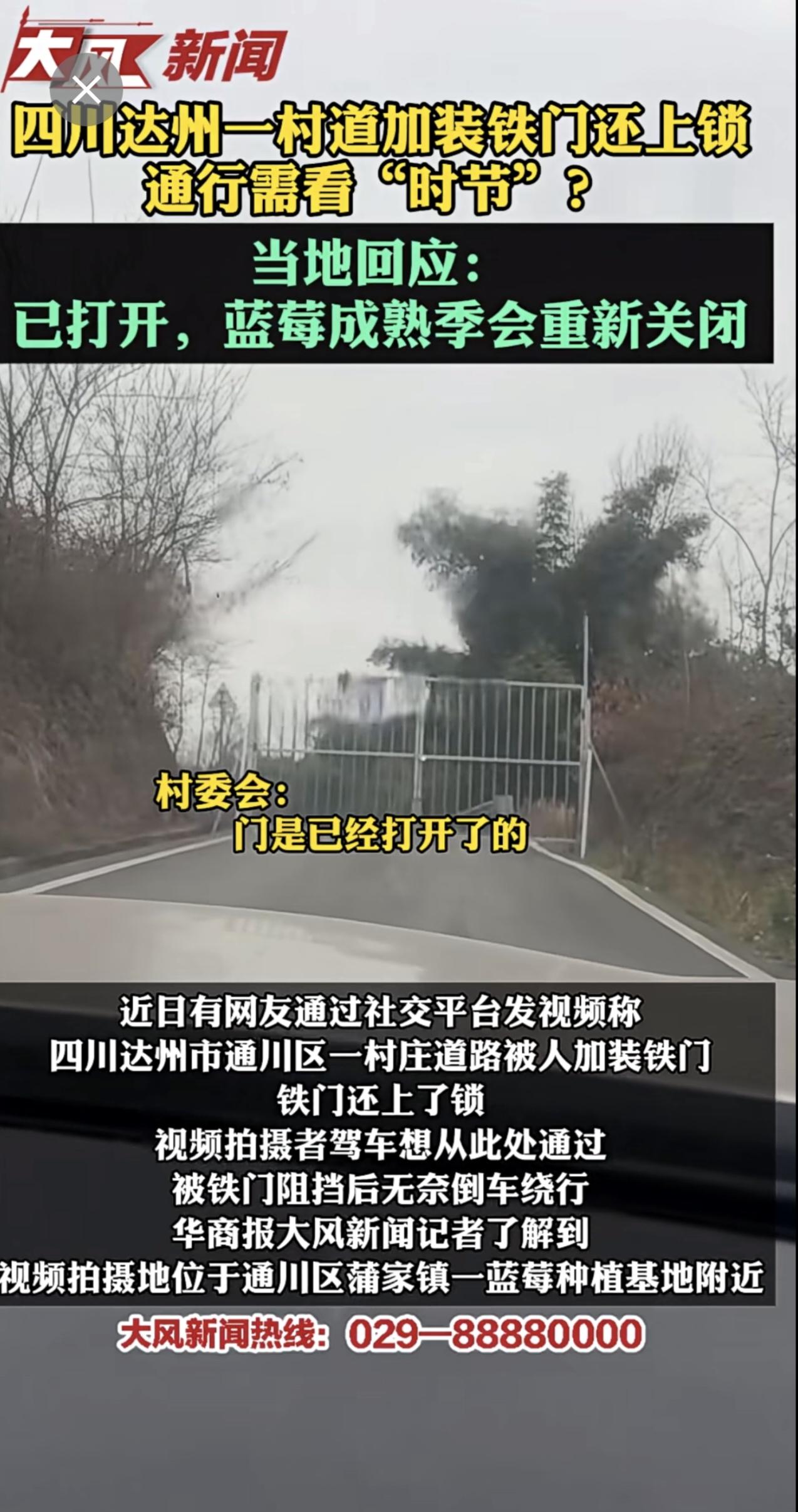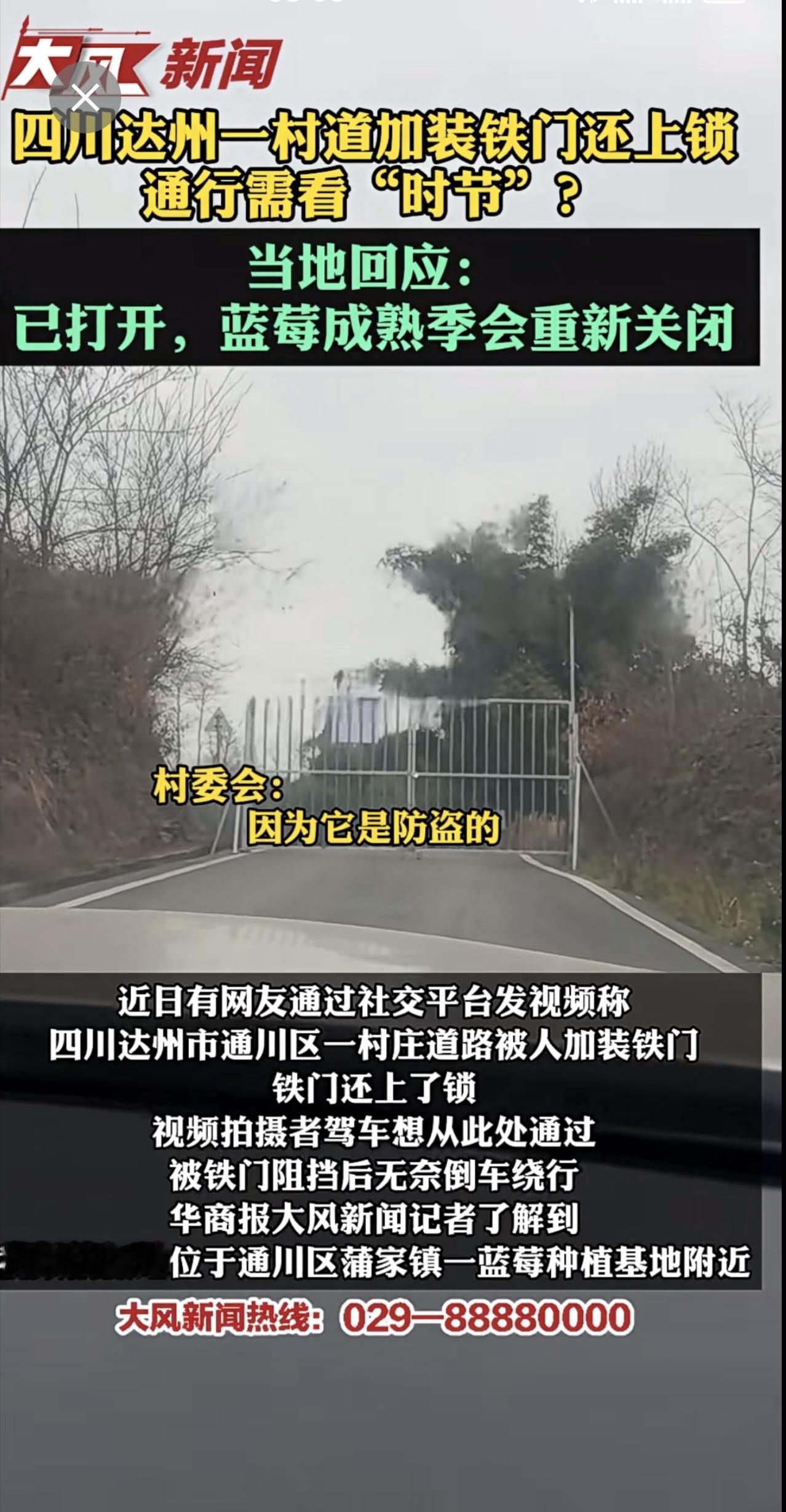 四川达州一村道加装铁门还上锁,通行需看“时节”?当地回应:已打开,蓝莓成熟季会重新关闭
