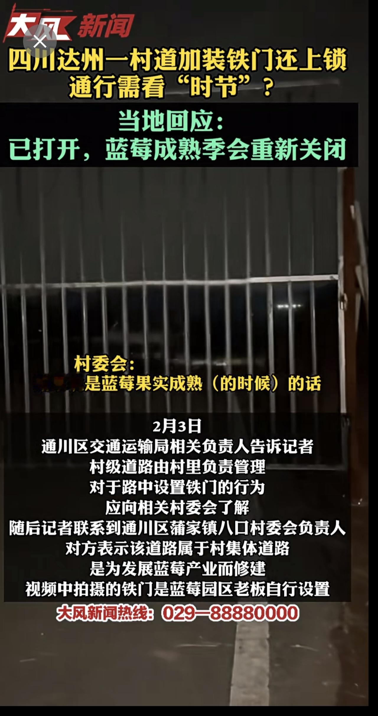 四川达州一村道加装铁门还上锁,通行需看“时节”?当地回应:已打开,蓝莓成熟季会重