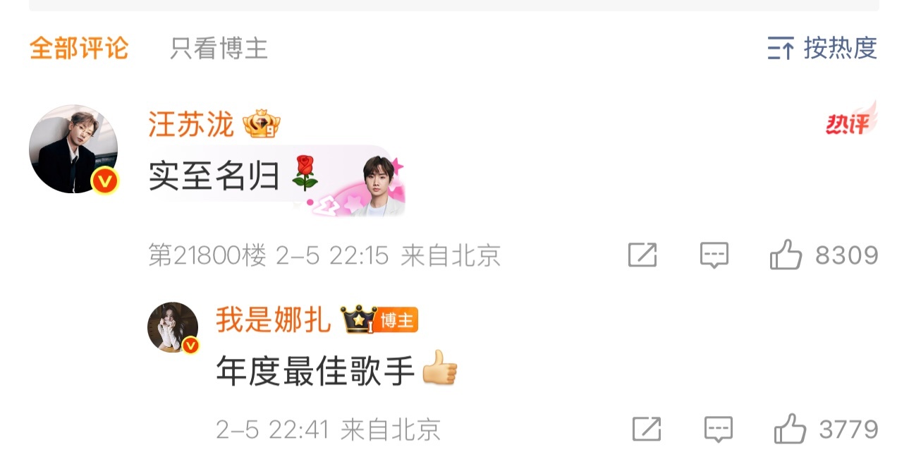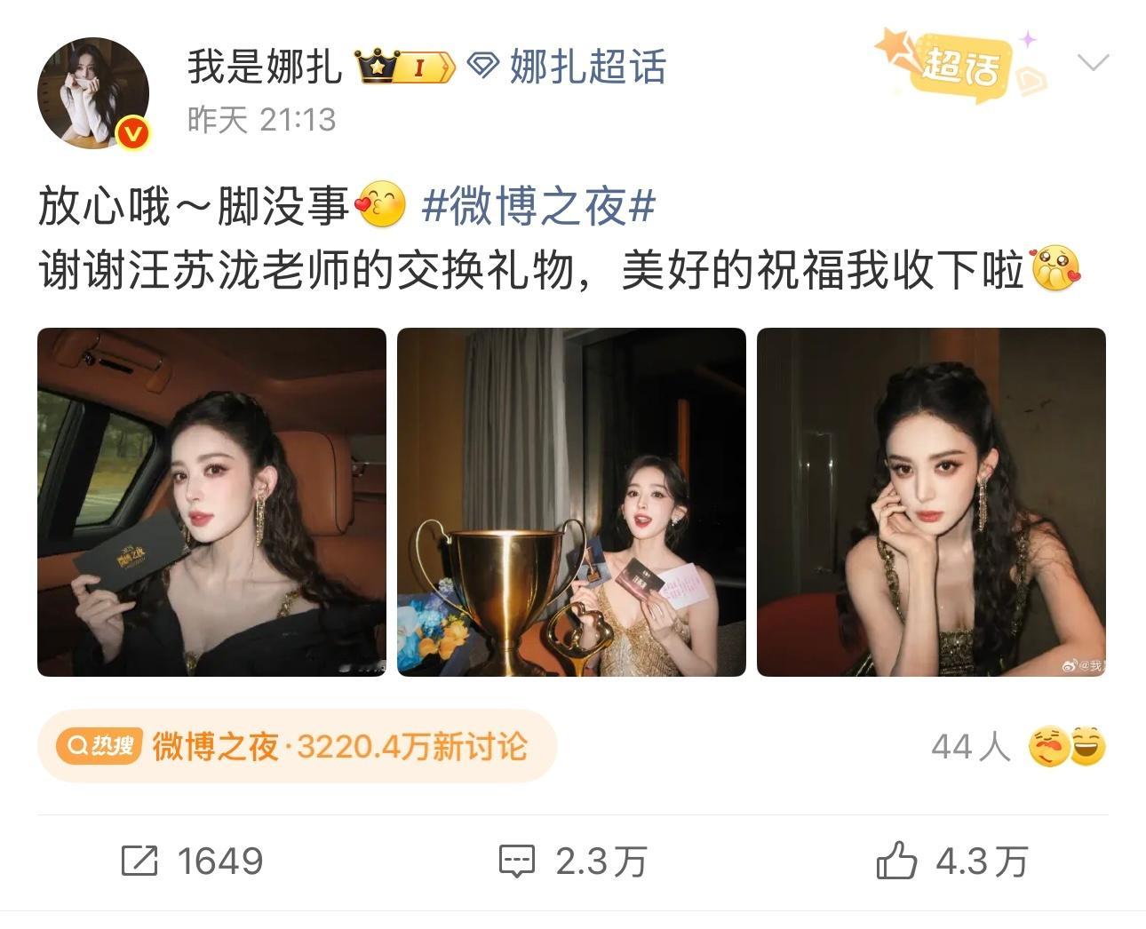 汪苏泷回复娜扎又是一集爱看的破次元互动!!娜扎发文报平安说脚没事,并感谢汪苏泷的交换礼物!Duang大一个巨型全能艺人奖杯🏆汪苏泷回复娜扎:“实至名归”娜扎回复:“年度最佳歌手”好好好我们漂亮智慧的荣善宝和我们爆曲制造机Silence Wang就这么水灵灵地联动我宣布你俩都是全能艺人 汪苏泷说娜扎实至名归