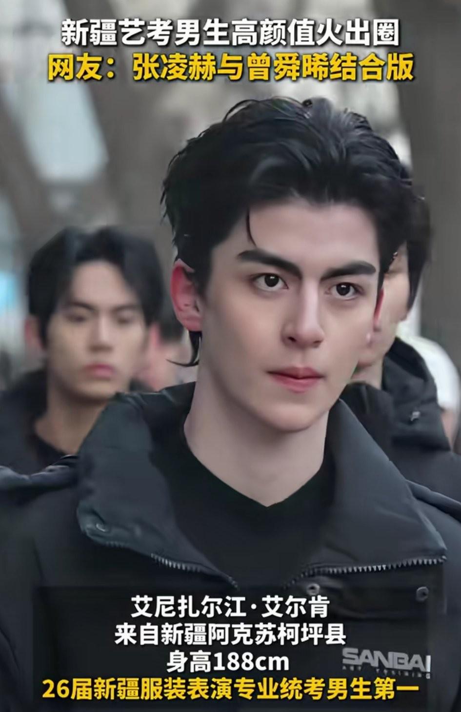 这几天新疆的一位艺考男生颜值在网上火出圈了,有人说又看到了陈冠希的影子,有的说像张凌赫和曾舜晞的结合版,还有人说他是王鹤棣,陈冠希,霍建华的精华版,这还了得,他们每一个都是顶级的帅哥了,再被冠于多少的结合体,其颜值高到何种程度,其实他就是他自己,他是独一无二的,五官精致立体深邃,皮相骨相俱佳的男生,他叫艾尼扎尔江.艾尔肯,一个来自新疆的小帅哥。