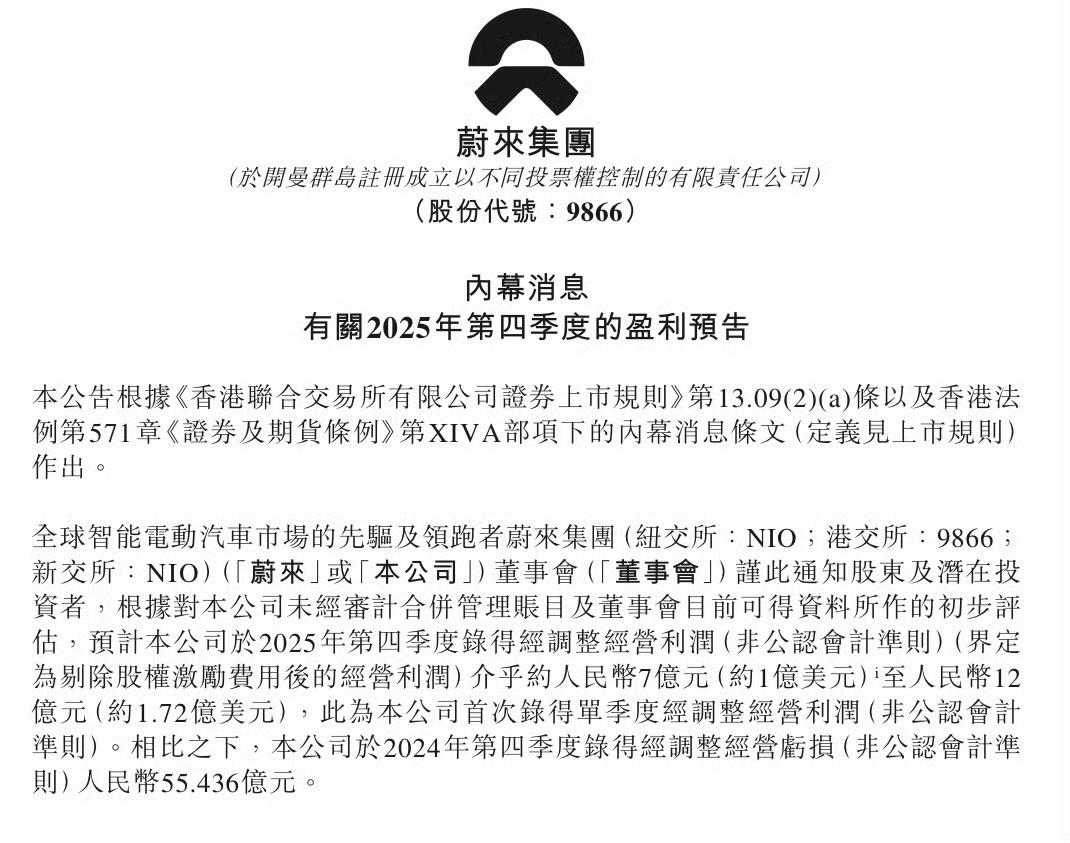 蔚来发布2025年第四季度盈利预告: 预计公司2025年第四季度录得经调整经营利润(非公认会计准则),介于7-12亿元人民币之间。 这是蔚来11年第一次单季度经调整经营利。 这个盈利实际上是剔除股权激励费用之后的经营利润。【来自懂车帝车友圈】