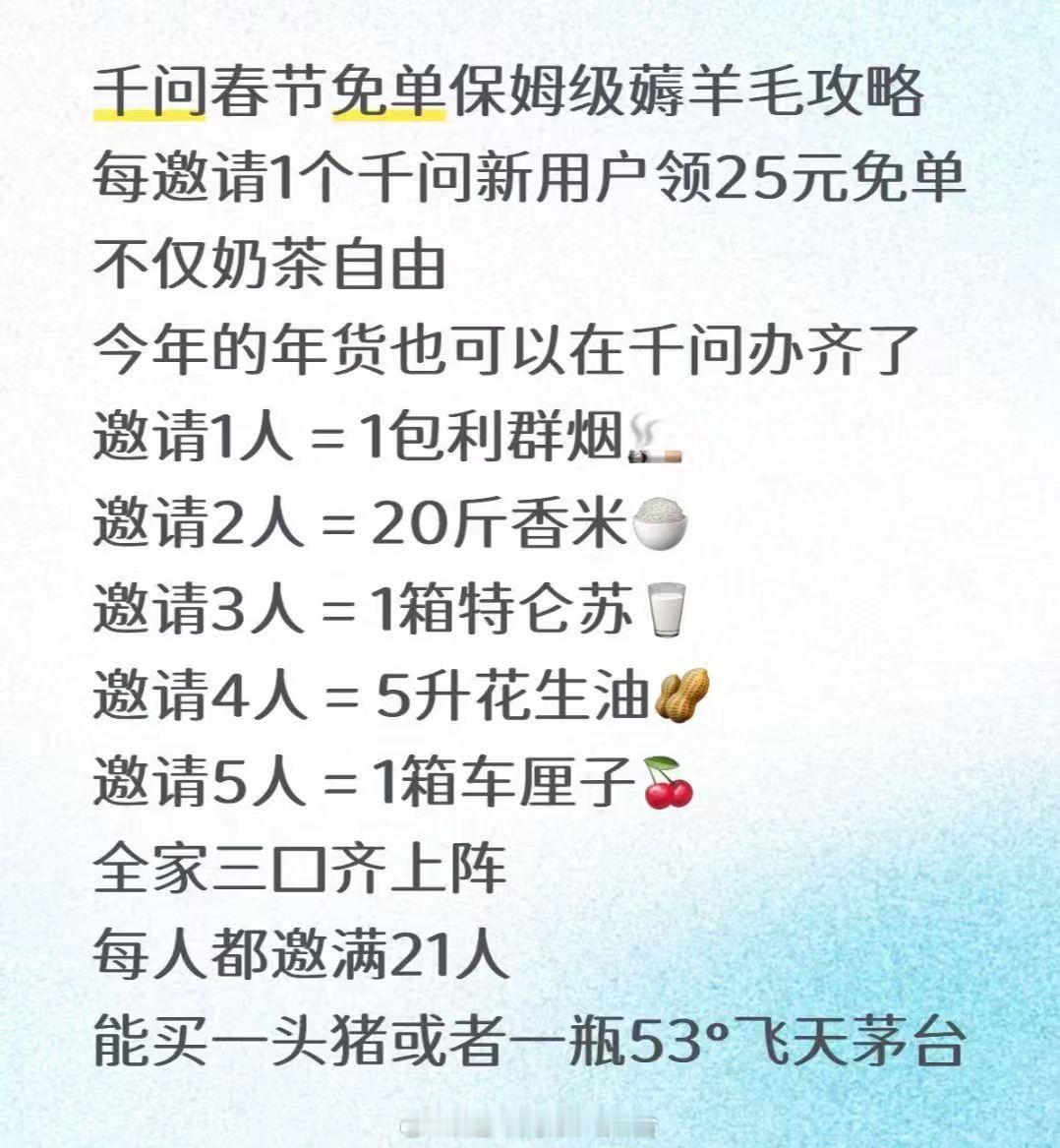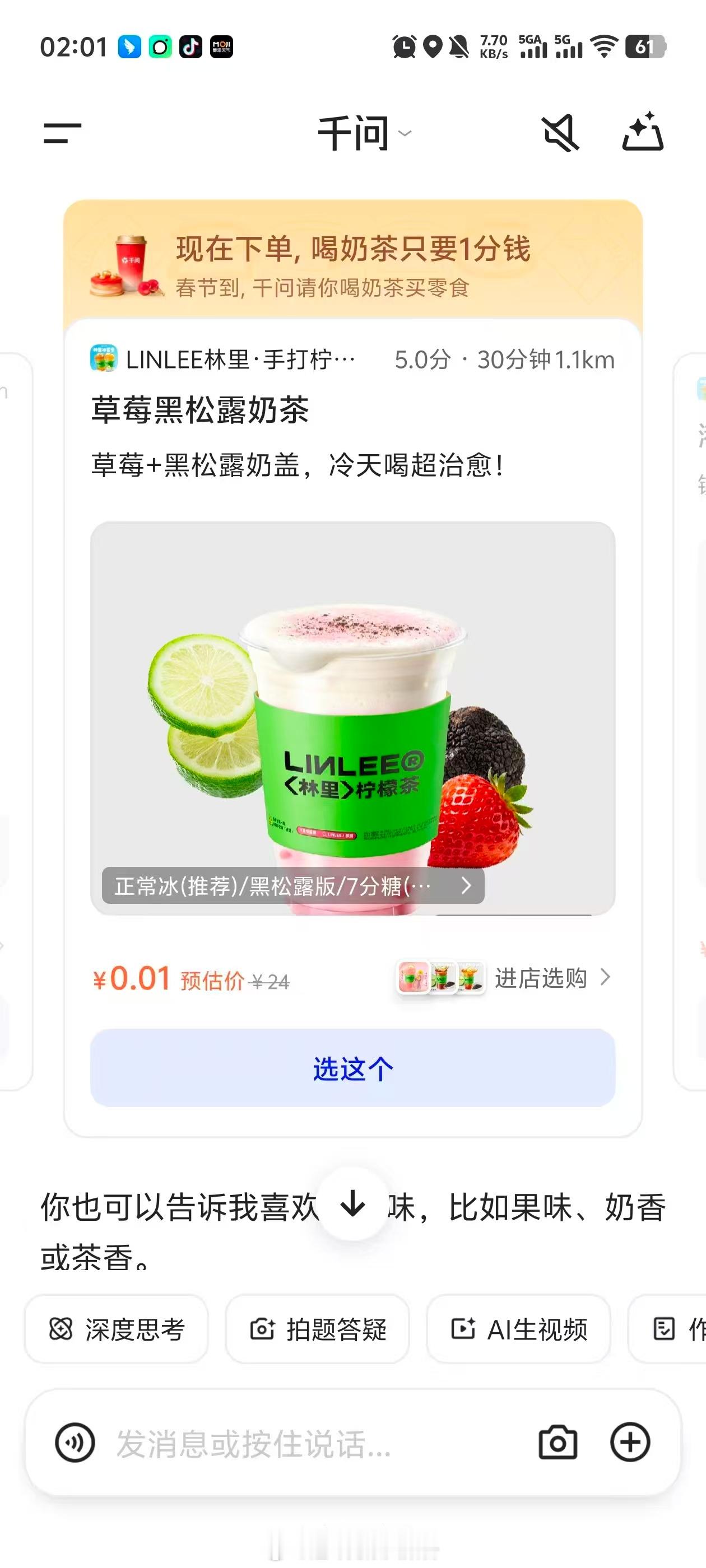 手把手教你薅千问免单奶茶今天教妈妈用手机点外卖,顺手安利了千问这个活动。教她对着APP说“想喝热的,不要太甜”,AI很快推荐了好几款。用免单卡抵扣25元,实际支付就1分钱。妈妈觉得很神奇,现在她逢人就分享。千问这次“春节30亿大免单”覆盖新老用户,等到2月12日第二波福利开启,还能有更多福利。看着长辈也轻松玩转AI,感觉科技正悄悄改变生活。