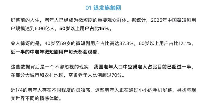 短剧和AI成为老年人情绪价值新来源 如果从更长的时间尺度来看,这并不是一个突然出现的现象,而是一种迟早会发生的转移。 传统社会里,老年人的情绪与健康管理,长期依附于家庭结构本身;当子女外出、家庭小型化成为常态,这一功能必然外溢。短剧填补的是时间与陪伴的空白,而能听懂方言、可以直接打电话的蚂蚁阿福,则在一定程度上接手了原本由熟人社会承担的倾听与回应功能。技术并非创造了需求,只是补上了已经出现的缺口。老年人有自己的电子闺蜜。
