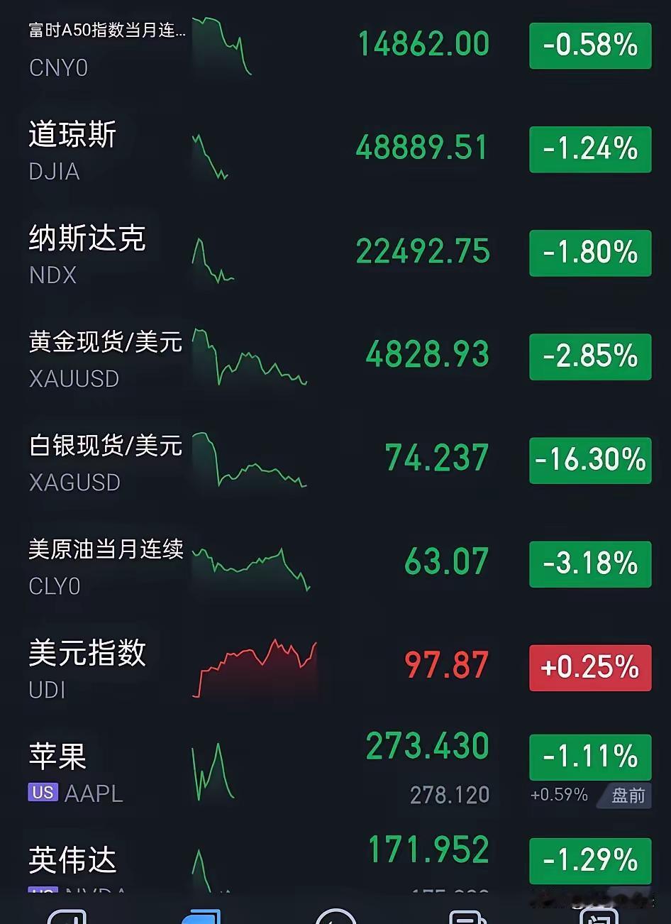 白银暴跌大消息。美股暴跌,白银遭受重创,外资唱空,我在2025年,视频中说过,老特很可能与美联储唱双簧,联合华尔街收割全世界。 老说都是总结出来的真理。买在无人问津时,卖在人声鼎沸时。黄金白银,前段时间暴涨,多少冲动,失去了理智。这一次你们就长教训了,一遭被蛇咬,十年怕井绳。 2013年黄金大屠杀,还是历历在目。只不过这次是白银。 全球黄金的基准定价在伦敦(现货)和纽约(COMEX期货),白银类似。美国通过华尔街投行、大型基金和交易所,主导着衍生品交易和价格发现。 黄金:暴跌; 白银:暴跌; 标普500指数:暴跌 比特币:暴跌。 内容比较多,你们可以查查,
