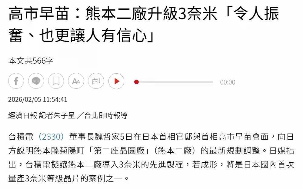 太突然了!太讽刺了吧!台积电董事长会见高市早苗,台国民党:“硅盾”没了! 在阅读此文之时,麻烦您点击一下“关注”,既方便您进行讨论和分享,又能给您带来不一样的参与感,感谢您的支持。 就在2月5号,台积电董事长魏哲家在东京跟日本首相高市早苗见了面。台积电通过新闻稿正式宣布:正在评估规划将日本熊本二厂导入更先进的3纳米制程。对此,国民党立委表示:台湾赖以自保的“硅盾”马上就要变成千疮百孔的破窗,所谓的产业屏障再也护不住台湾,紧接着,台积电一纸新闻稿直接把岛内炸开了锅:原本规划给日本熊本二厂的制程,居然要直接升级到3纳米。 现在魏哲家一句话,把3纳米这种压箱底的技术放到日本,等于直接拆掉硅盾最核心的钢板,交给一直炒作“台湾有事就是日本有事”的极右翼势力,台湾的产业安全、经济安全瞬间暴露在风险之中,魏哲家这次见高市早苗,说白了就是把这块盾牌上最硬的那块钢板,亲手拆下来送给了日本。这种为了迎合美日霸权、不顾民族利益的操作,不是卖国是什么? 更过分的是,美国直接要求凤凰城工厂和台湾总部数据实时同步,相当于在台积电总部装了全天候监控摄像头,核心技术、生产数据毫无秘密可言。 网友,大路朝天,各走一边。我们自己走自己的路,在我们穷的掉渣时,能造原子弹。别人能造的,我们也能造,他强任他强,轻风拂山岗,任凭风浪起,稔坐钓鱼台。