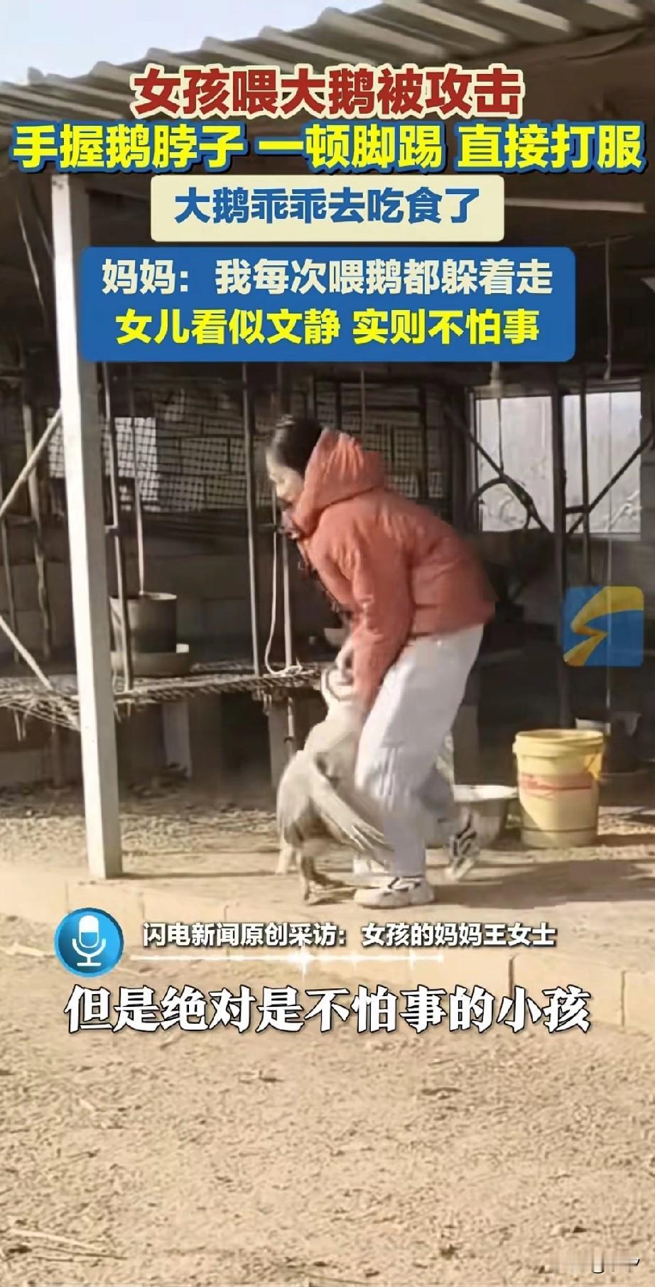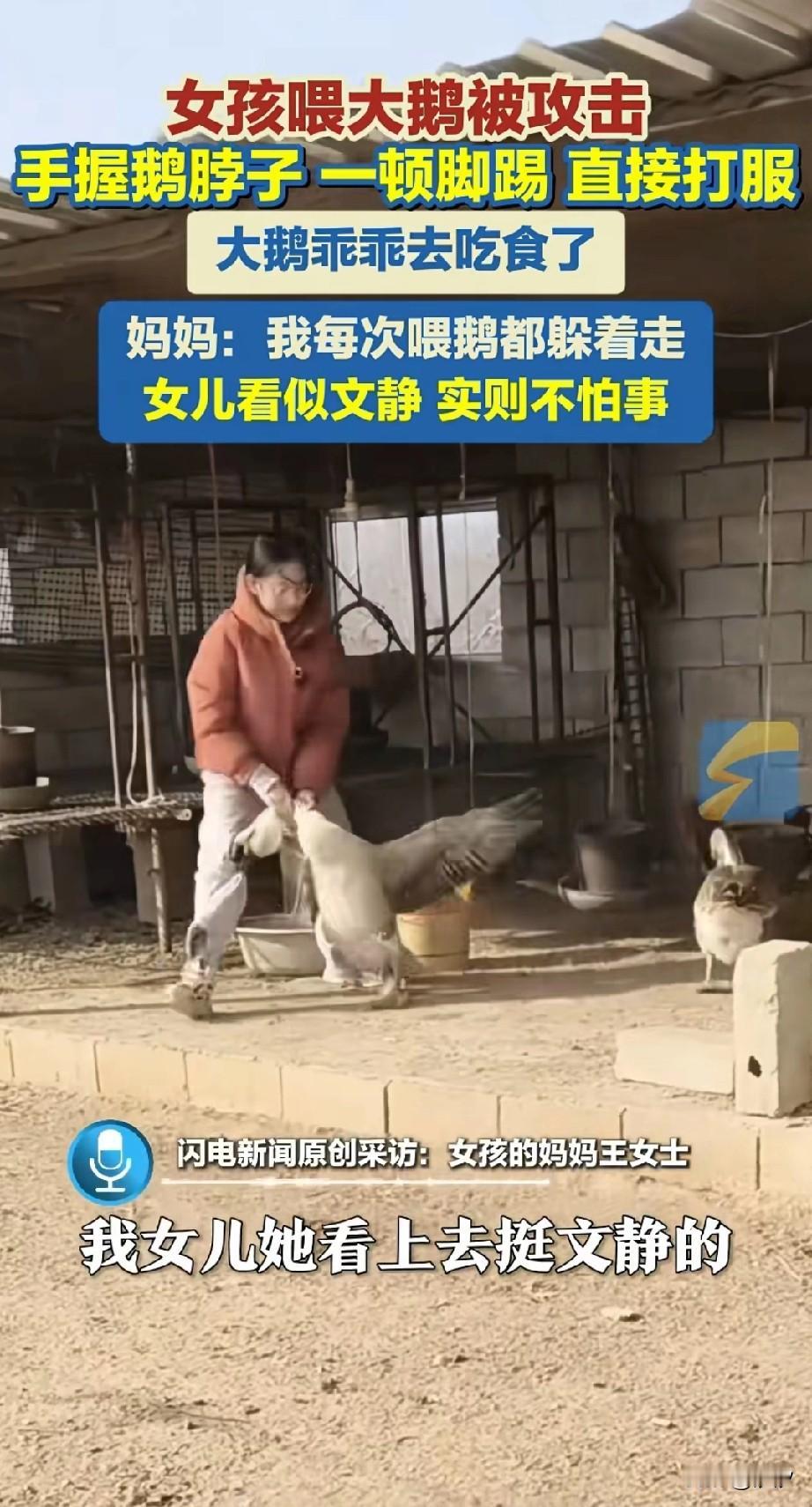 山东女孩帮自己的妈妈喂大鹅,结果却被大鹅给攻击了,女孩二话不说直接上去薅着大鹅! 对着它就是一顿招呼,大鹅非常不服气,还对她进行攻击,她也丝毫不惯着大鹅! 掐着大鹅的脖子就开始狂踹,大鹅都被打蒙了,肯定在想,平时都是我欺负别人,怎么还敢有人欺负我? 于是张开翅膀,做出干架的动作,女孩直接上去抱住大鹅,又开始一顿招呼,这直接把大鹅给打服了! 之后大鹅乖乖的去吃食物了,在女孩面前也非常的老实,再也不敢欺负别人了! 女孩的妈妈表示自己的女儿平时非常的温柔,没想到女儿这么猛,看到妈妈自己平时喂大鹅都是躲着它! 没想到自己的女儿看似文静,实则不怕事,一顿脚踹,把大鹅给打服了!这个视频传到网络,直接把网友给笑疯了! 大家对于山东女孩把大鹅打服这事怎么看? 山东 大鹅女孩 鹅妈妈模仿 放鹅的小女孩 女生抓大鹅