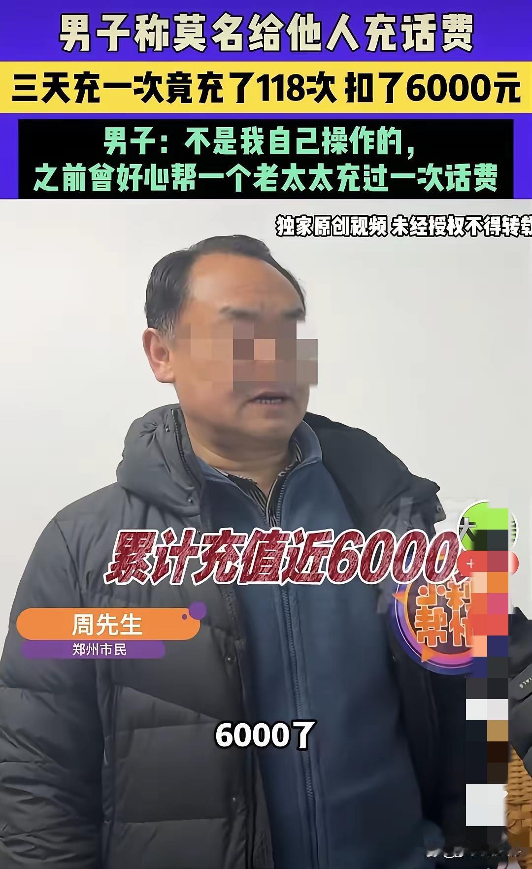 河南郑州有位男子好心给一位老太太充了50元话费,可没过多久,男子发现自己手机被扣了6000多元。到银行查看账单后,他才发现手机号被设定为自动给老太太手机充话费,一共充了118次。 原来,周先生看到同小区一位老太太手机欠费,其子女不在身边,老太太又不会充话费,便出于好心帮她充了50元。让周先生没想到的是,之后竟连续帮老太太充了118次话费,共计6000多元。周先生拨打人工客服电话,客服工作人员告知他,后台显示是他亲自操作。无奈之下,周先生只好报警。他又通过小区物业找到了被充话费的老太太,说明了情况。老太太家人听后十分意外,查了一下话费,确实多了5000多块钱。老太太家人当场表示愿意配合周先生一起维权。后来在消协和警方的帮助下,平台终于承认是系统漏洞所致,并退还了多扣的话费。 说实话,我也曾被这样的自动续费骗过。有一次晚上,我给电动车扫码充电,由于地下室灯光昏暗,我扫完码看到手机显示需交2元,便毫不犹豫地支付了。但电动车并未通电,我一查才发现充的2块钱是“水🍍险”。当时我觉得2块钱充错就充错了,没找平台麻烦。万万没想到,一个月后,“水🍍险”平台自动扣了我200多元,我这才明白平台上骗子真是无处不在。