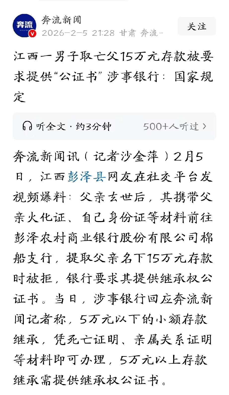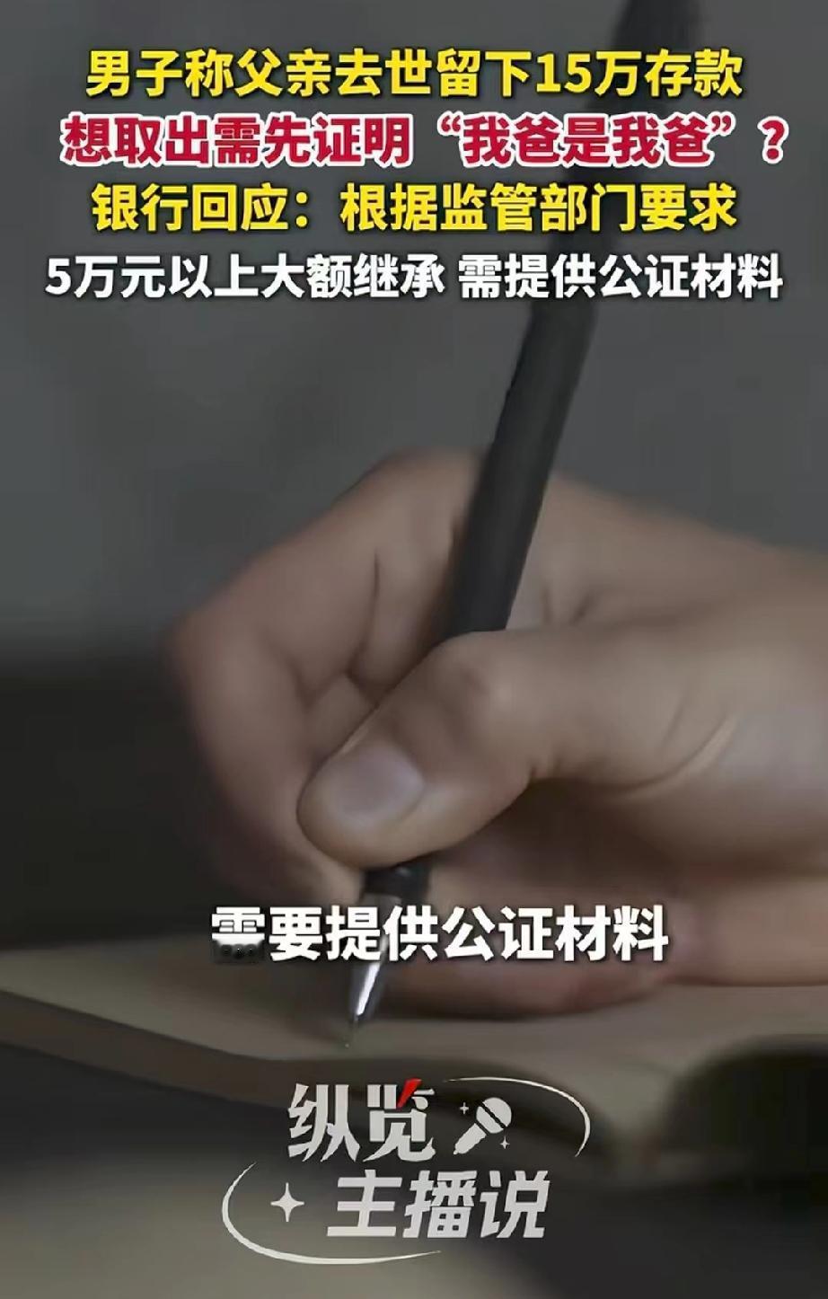 江西九江,男子父亲去世,他准备取出父亲名下的15万存款,风风光光送老人最后一程。谁知,当他准备好户口本、火化证等各种能证明亲属关系的证件到银行时,工作人员却表示,这钱取不了,还要做个公证,证明“你爸是你爸”。男子怒了,父亲的遗体就在殡仪馆,自己着急用钱,银行是将简单的事情复杂化,是故意刁难。于是,他一气之下将此事发到了网上。 男子父亲不幸离世,遗体还停放在殡仪馆,家里等着用钱,抓紧时间处理后事。 父亲名下有15万元银行存款,男子想着,父亲的钱都用在父亲身上,这是最合适不过的,所以,他准备去银行把钱取出来,风风光光的送父亲最后一程。 他知道,银行规矩比较多,为了节约时间,男子提前准备好了能证明关系的户口本、父亲的火化证,还有自己的身份证件。 这些材料应该足够证明自己的身份以及和父亲的亲属关系了,取钱应该不成问题。 于是,他带着这些材料,赶紧前往银行,到了银行,他按照流程向工作人员说明情况,提交了材料,等待取钱。 可没想到,银行工作人员却告知他,5万元以下的小额存款继承,凭死亡证明、亲属关系证明等材料就可以办理。 但他要取的这15万元超过了5万元,必须额外提供继承权公证书才行。 男子一听就懵了,我都带了户口本这些能证明关系的证件了,怎么还要证明我爸是我爸呢? 这分明是把简单的事情复杂化,故意刁难。男子情绪有些激动,便把这件事发到了网上。 视频发出后,银行两次派人与男子协商,但都没有结果。 还有人关注到,办理业务的工作人员未穿统一工装,质疑银行是否存在外包情况。 对此,银行工作人员解释,说并非要求客户证明“父子关系”,而是5万元以上存款继承需提供继承权公证书,这是国家金融监管总局和人民银行的明确规定。 当事人年纪稍大,对相关政策和要求不太了解,之后其年轻亲属主动联系银行,银行已向其详细解释了相关规定,对方表示理解。 关于网友“工作人员未穿工装”的质疑,银行方面也给出了回应,称涉事工作人员为新员工,工作服尚未发放到位,并非网友揣测的“外包”情况。 银行的行为究竟是合规合法还是有意刁难呢? 《中国人民银行关于执行〈储蓄管理条例〉的若干规定》第40条规定:存款人死亡后,合法继承人为证明自己的身份和有权提取该项存款,应向储蓄机构所在地的公证处申请办理继承权证明书,储蓄机构凭以办理过户或支付手续。 银行要求男子提供继承权公证书,完全符合上述金融监管规定。 男子虽有户口本、火化证等亲属关系材料,但15万元远超5万元小额免公证限额 。 银行作为资金托管方,无法仅凭亲属关系证明确认其为唯一合法继承人,要求公证是为防范继承纠纷、规避法律风险,并非“故意刁难”。 男子可先办理继承权公证或通过法院诉讼取得生效文书,再合规取钱。 男子的着急可以理解,但银行确实是按规定办事确实不算刁难。 不过老百姓家里办丧事急用钱,手续又繁琐,确实太折腾人,劳心费神。 希望银行能多站在群众角度,急事特办、简化流程,大家也多理解监管要求,互相体谅,办事才能更顺畅暖心。