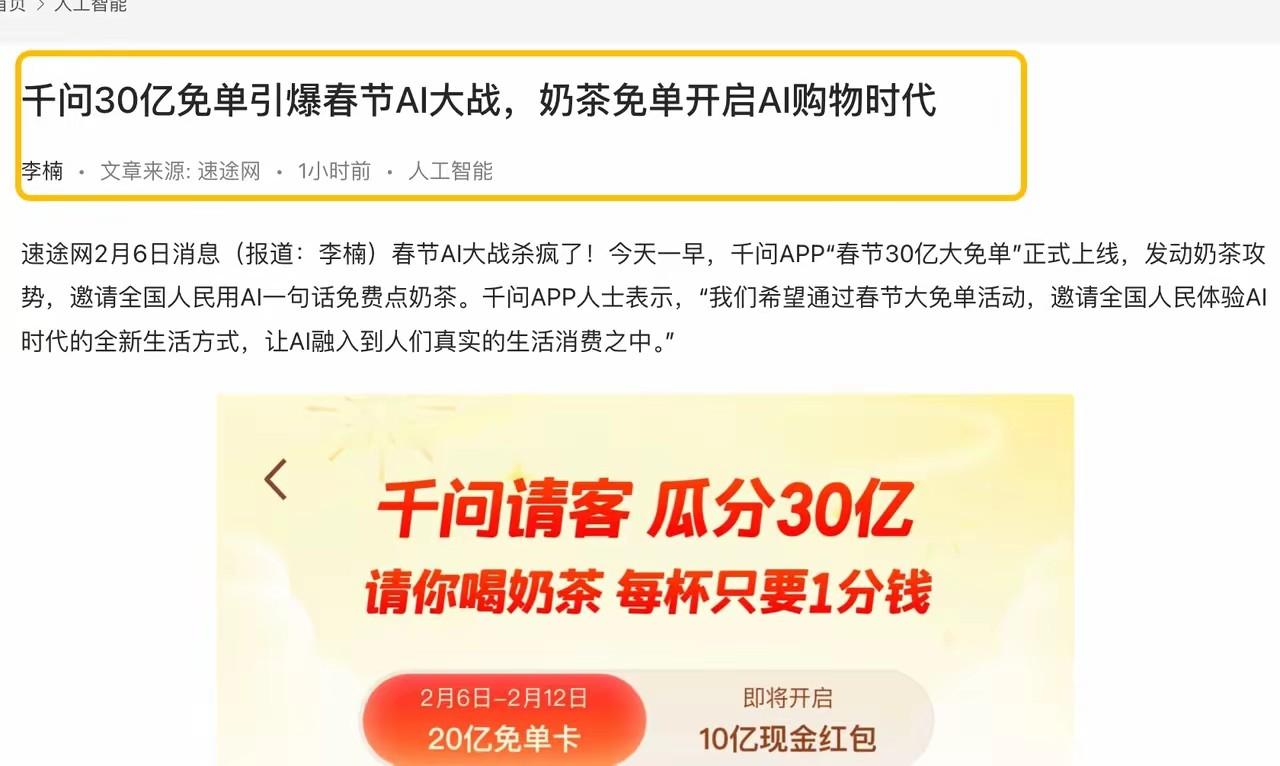 今年春节,通义千问真的“杀疯了”——直接豪掷30亿元补贴用户!不是画饼,是实打实的免单券、红包、消费补贴,覆盖奶茶、外卖、电影票、打车、超市购物……只要你用得上,它就敢送! 我亲自试了下,打开通义App,首页弹出“春节大免单”活动入口,领了一张21元无门槛券,下午就兑换了两杯热乎乎的芋泥波波奶茶,直接省出一顿早餐钱!更夸张的是,好友还抽中了“全年奶茶免单”,每天一杯,连喝365天!评论区已经有人晒单:超市买年货立减50、打车直接免单、甚至电影票都免费了…… 这次活动从除夕一直持续到元宵,关键是操作超简单:签到、做任务、邀请好友,券就到账。通义千问这波不是“撒钱”,是把钱塞你手里还帮你花出去! 一代人有一代人的福利,我们这代人的“鸡蛋”,就藏在通义千问的春节红包里。别等了,赶紧去领,晚了真没了!通义千问春节免单 30亿补贴真实有效