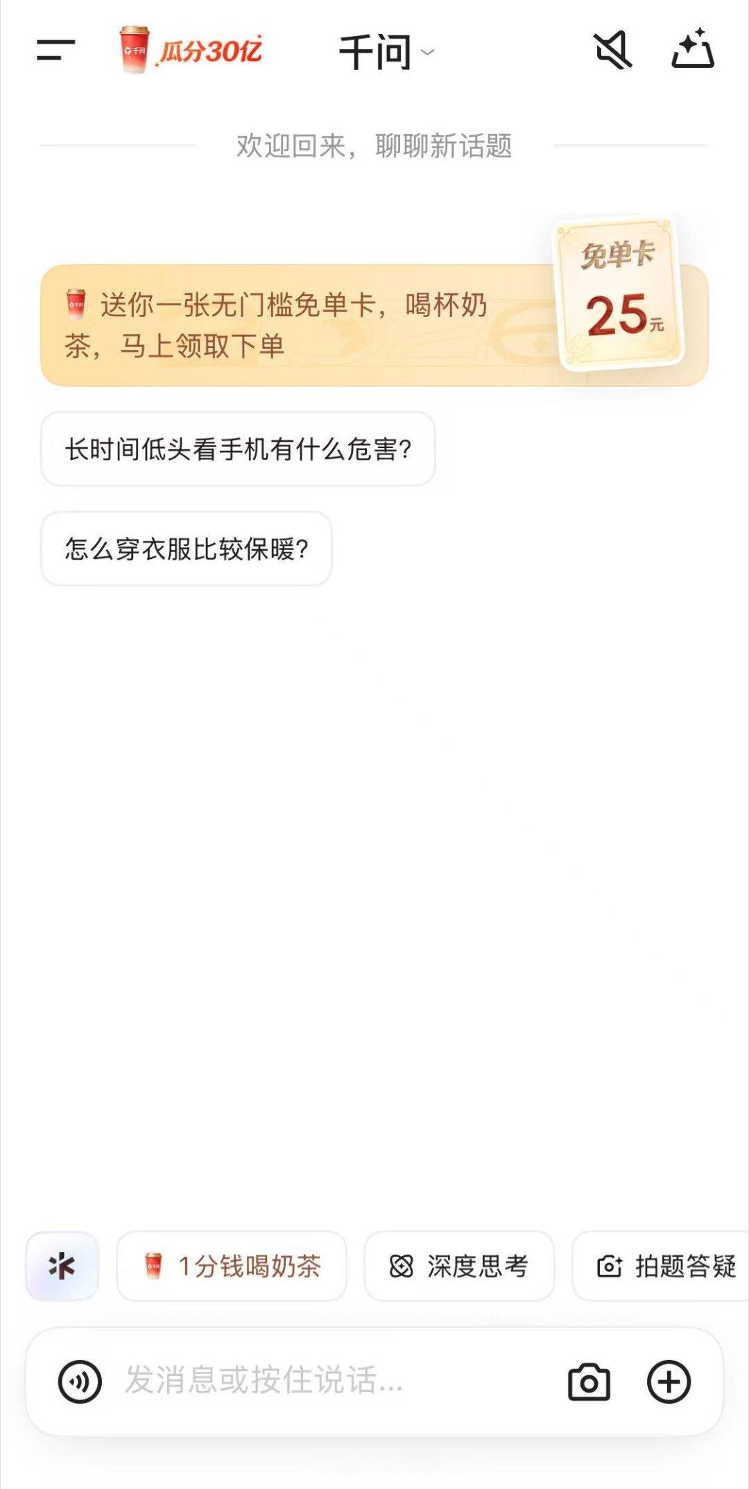 千问免单 抽奖详情 千问春节这波真的杀疯了!直接豪掷30亿请全国人民喝奶茶、吃喝玩乐全免单,福利实在太大了!我体验了一下AI点单,动动嘴就能轻松薅羊毛,省心又省钱,简直爽翻天!我也来加码一波,评论区随机揪5位朋友,你点我请!快来分享你的千问使用心得,一起快乐薅羊毛!