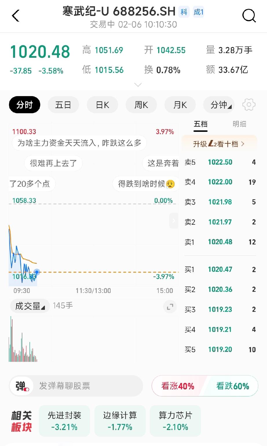 哎呀,愁死了!这寒武纪今天又大跌3.6个百分点,5日连跌快20个点了。它的股价曾一度超越茅台,是中国股市第一高价股,如今却不断下跌。不过最近酒水股涨势还不错,看来寒武纪要超过茅台是没希望了。