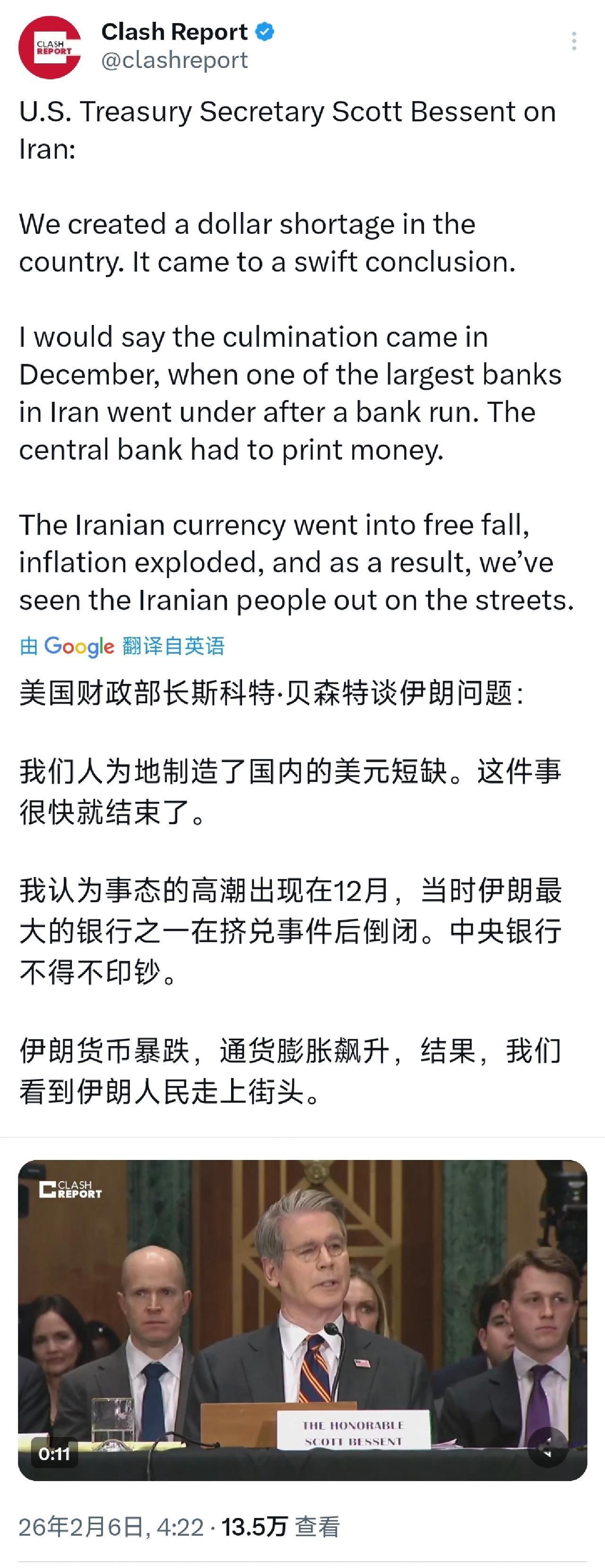 美国财政部长斯科特·贝森特今天(北京时间2月6日)关于伊朗的言论:“我们在这个国家造成了美元短缺的局面。这件事很快就结束了。我认为事态的高潮出现在12月,当时伊朗最大的银行之一在挤兑事件后倒闭。中央银行不得不印钞。伊朗货币大幅贬值,通货膨胀急剧上升,因此,我们看到了伊朗民众走上街头抗议。” [机智]评几句:美国黑手是伊朗乱局的始作俑者,贝森特公然炫耀人为制造伊朗美元短缺、引爆银行挤兑与货币通胀、催生民众抗议的恶行,这般自鸣得意的混蛋,把亲手制造的人道主义灾难当作政绩邀功,对伊朗民众承受的深重痛苦沾沾自喜,毫无道义底线与人性良知,霸权嘴脸暴露无遗,难怪全世界正义之士都痛恨美国的霸道行径。同时也要清醒看到,伊朗自身经济结构失衡、治理短板突出,国内民生困顿、社会矛盾长期累积,才给了美国这类外部干涉势力可乘之机,正所谓苍蝇不叮无缝的蛋,自身治理失序与经济脆弱,才让霸权制裁的破坏力被无限放大,这也给所有发展中国家敲响了居安思危、筑牢内生发展根基的警钟。