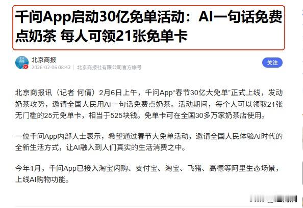 距离春节已经没多少天了,很多人已经踏上回家的路了。今天上午,阿里千问正式上线了“春节30亿大免单”,第一波要请大家喝奶茶,连请7天。